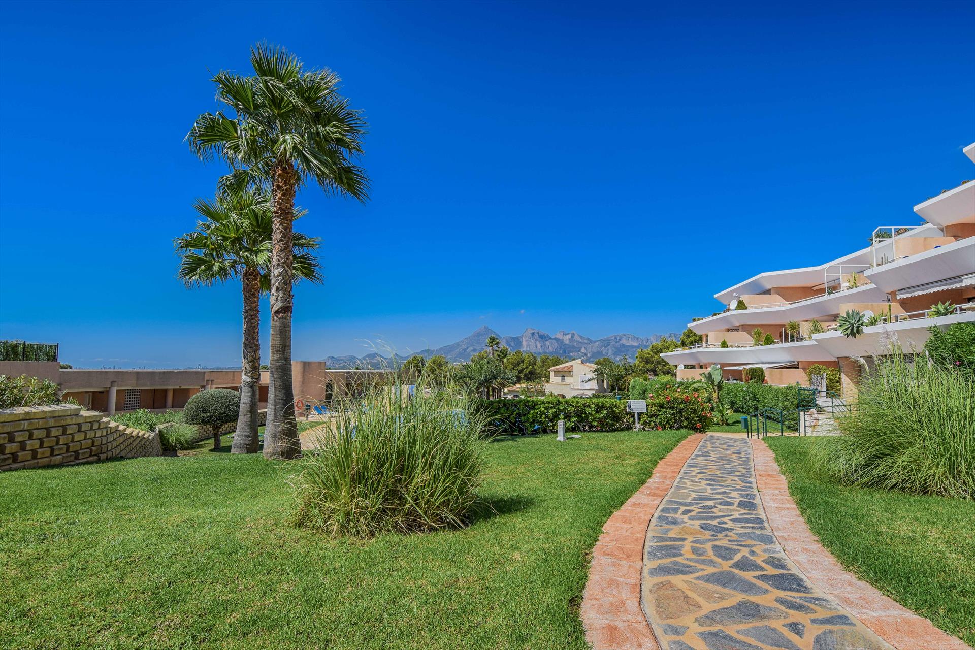 El apartamento cuenta con 4 dormitorios y 2 baños. El alojamiento ofrece privacidad, un jardín comunitario con césped y árboles, y hermosas vistas al mar y al jardín. Su comodidad y la proximidad de la playa, lugares para ir de compras, actividades deportivas, vida nocturna, lugares de interés y cultura hacen de este un excelente apartamento para pasar sus vacaciones en España con familiares o amigos.