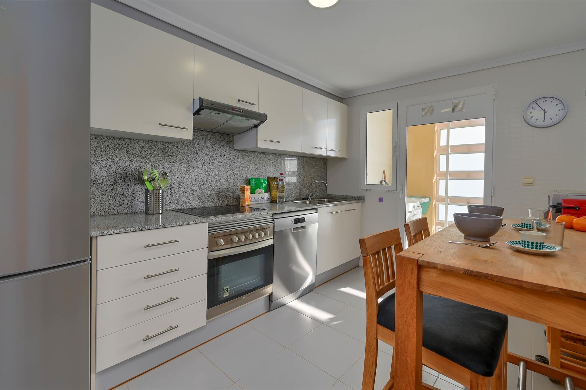 • Cocina con placa eléctrica, horno eléctrico, microondas, lavavajillas, frigorífico-congelador, cafetera, hervidor eléctrico, batidora, tostadora y exprimidor