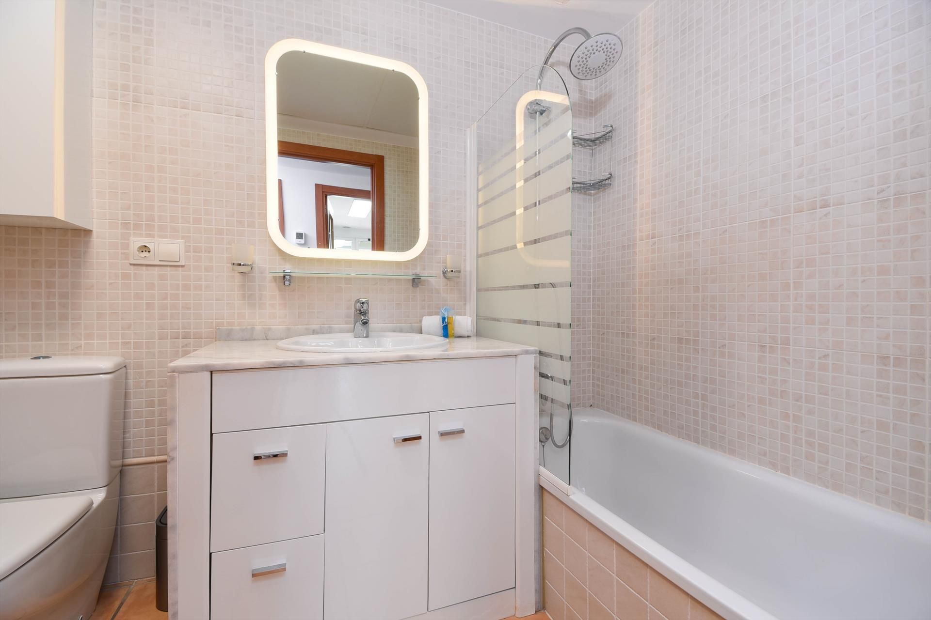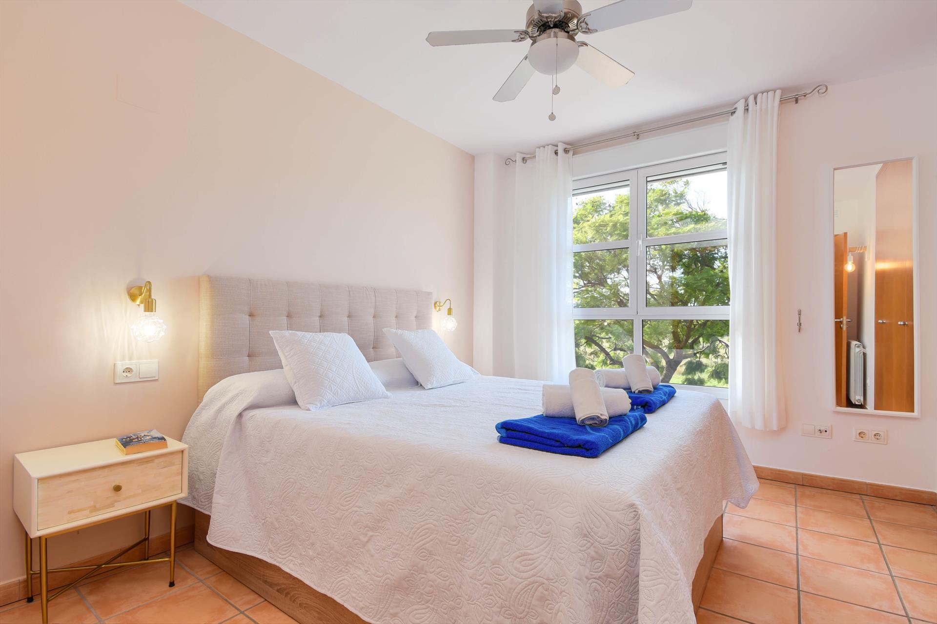 El apartamento tiene 2 dormitorios y 2 baños. El alojamiento ofrece privacidad, un jardín comunitario con césped y árboles, y hermosas vistas a las montañas. Su comodidad y la proximidad a la playa, lugares para ir de compras, actividades deportivas, instalaciones de entretenimiento, lugares para salir, atracciones y cultura hacen de este un excelente apartamento para pasar sus vacaciones en España con familia o amigos.