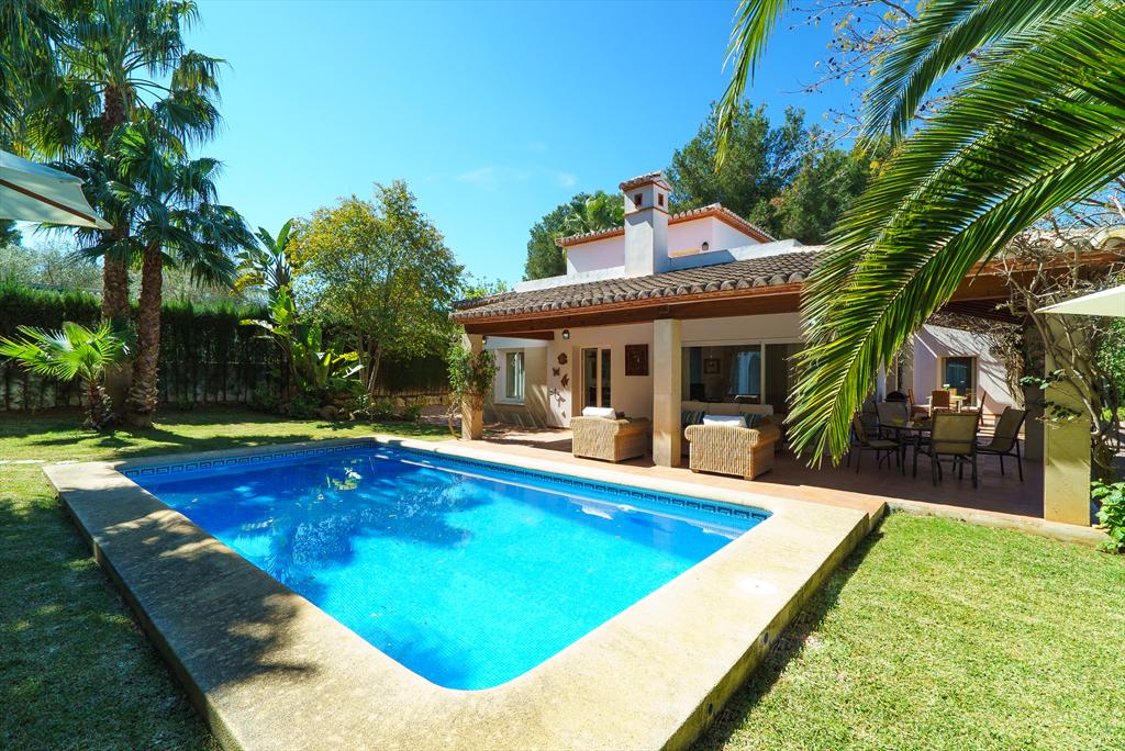 Amplia y confortable villa con piscina privada en Jávea, Costa Blanca, España, ideal para 4 personas. La casa está situada en una zona residencial de playa, a 1 km de la playa El Arenal de Jávea y a 1 km del Mediterráneo, Jávea.