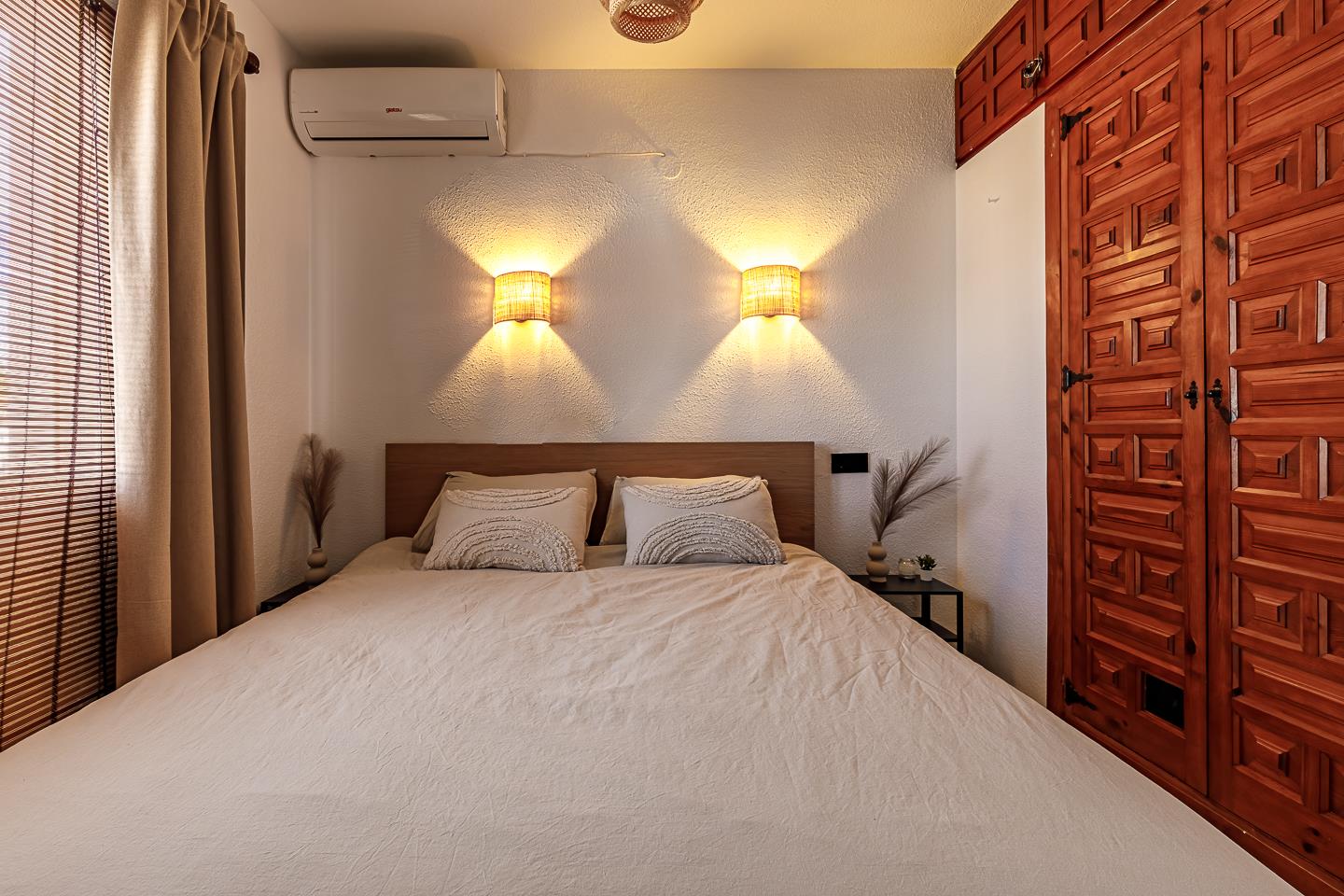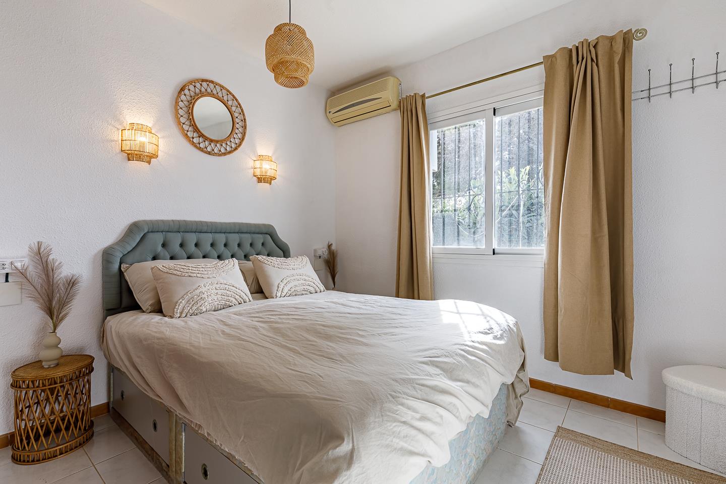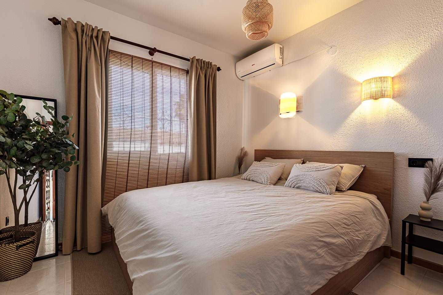 • dormitorio con aire acondicionado y cama tamaño queen (de 200 por 150 cm)