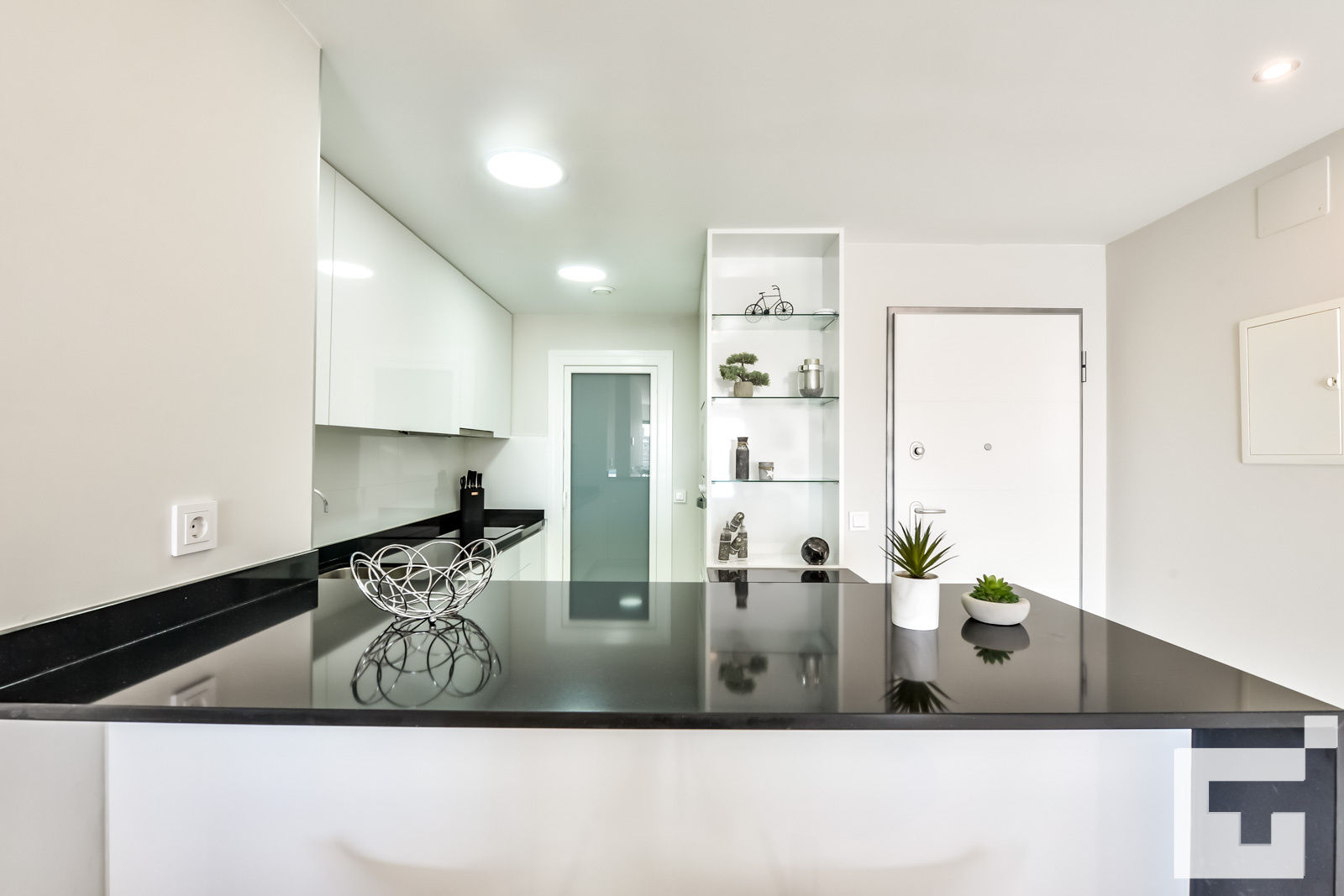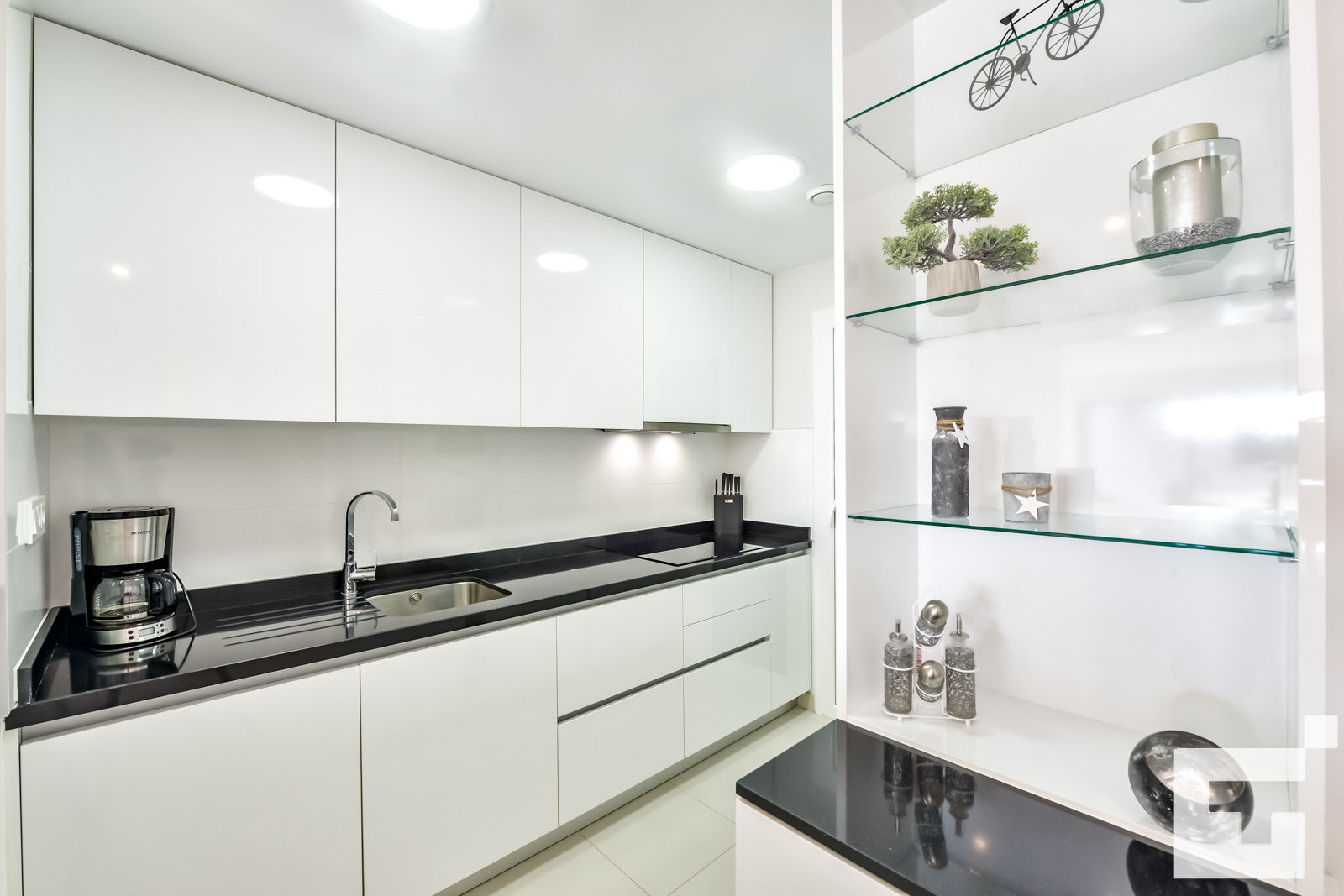 • cocina abierta con placa de inducción, horno eléctrico, microondas, lavavajillas, frigorífico, congelador, cafetera, hervidor eléctrico, batidora, tostadora y exprimidor