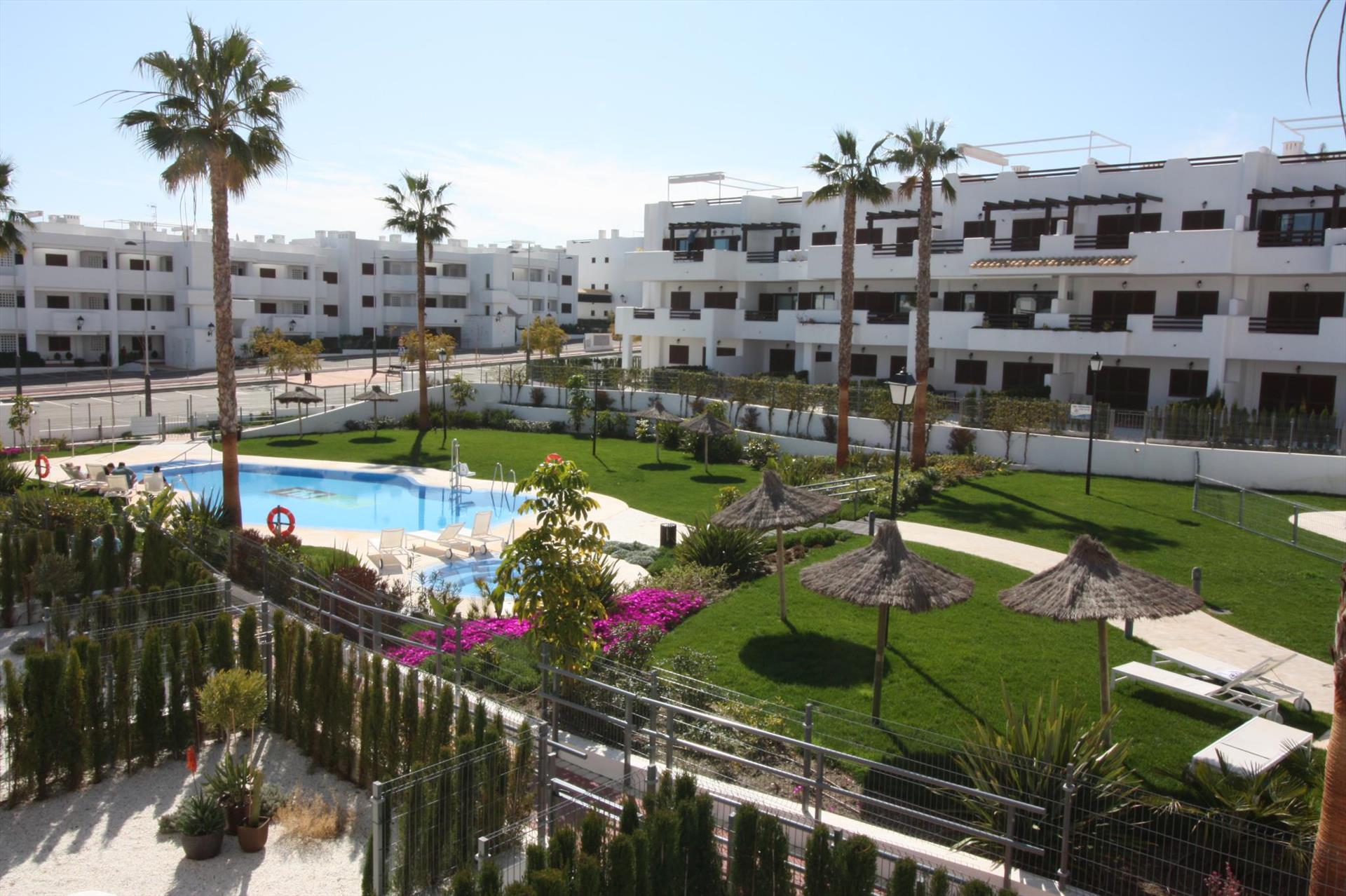 Incantevole e luminoso appartamento a San Juan de los Terreros, Andalusia, Spagna, con piscina comune per 4 persone. L'appartamento è situato in un complesso turistico in una zona residenziale e montuosa vicino alla spiaggia, a pochi passi da ristoranti e bar, supermercati e un campo da tennis, e a 500 m dalla spiaggia di Playa Nardos.