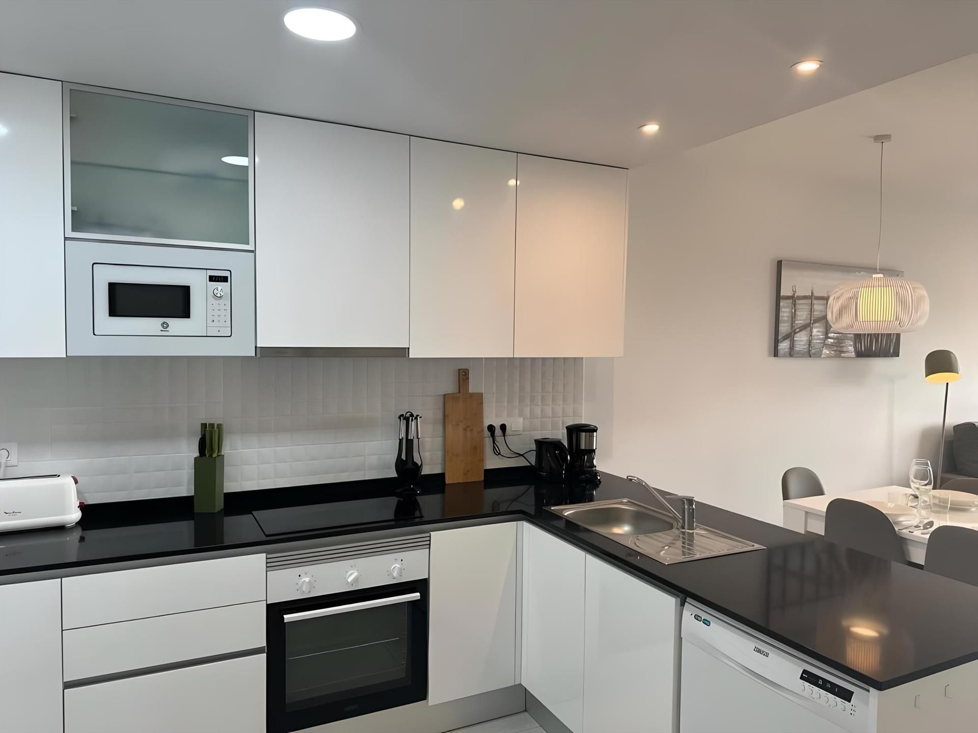 - cucina aperta con piano cottura elettrico, forno elettrico, microonde, lavastoviglie, frigorifero, macchina da caffè, bollitore elettrico, frullatore e tostapane
