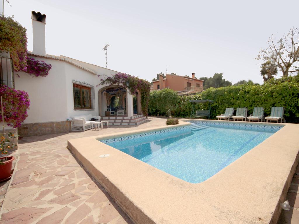 Bellissima e allegra villa con piscina privata a Jávea, Costa Blanca, Spagna per 10 persone. La casa è situata in una zona costiera e residenziale ed è a 3 km dalla spiaggia di El Arenal.