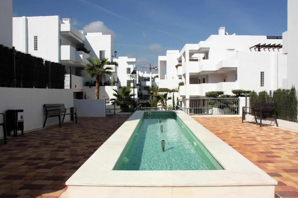 Schöne und gemütliche Ferienwohnung mit Gemeinschaftspool in San Juan de los Terreros, Andalusien, Spanien, für 6 Personen. Die Wohnung befindet sich in einer Ferienanlage, in einem Wohnstrandgebiet, in der Nähe von Restaurants und Bars, Supermärkten und einem Tennisplatz und 500 m vom Strand Playa Nardos entfernt.
