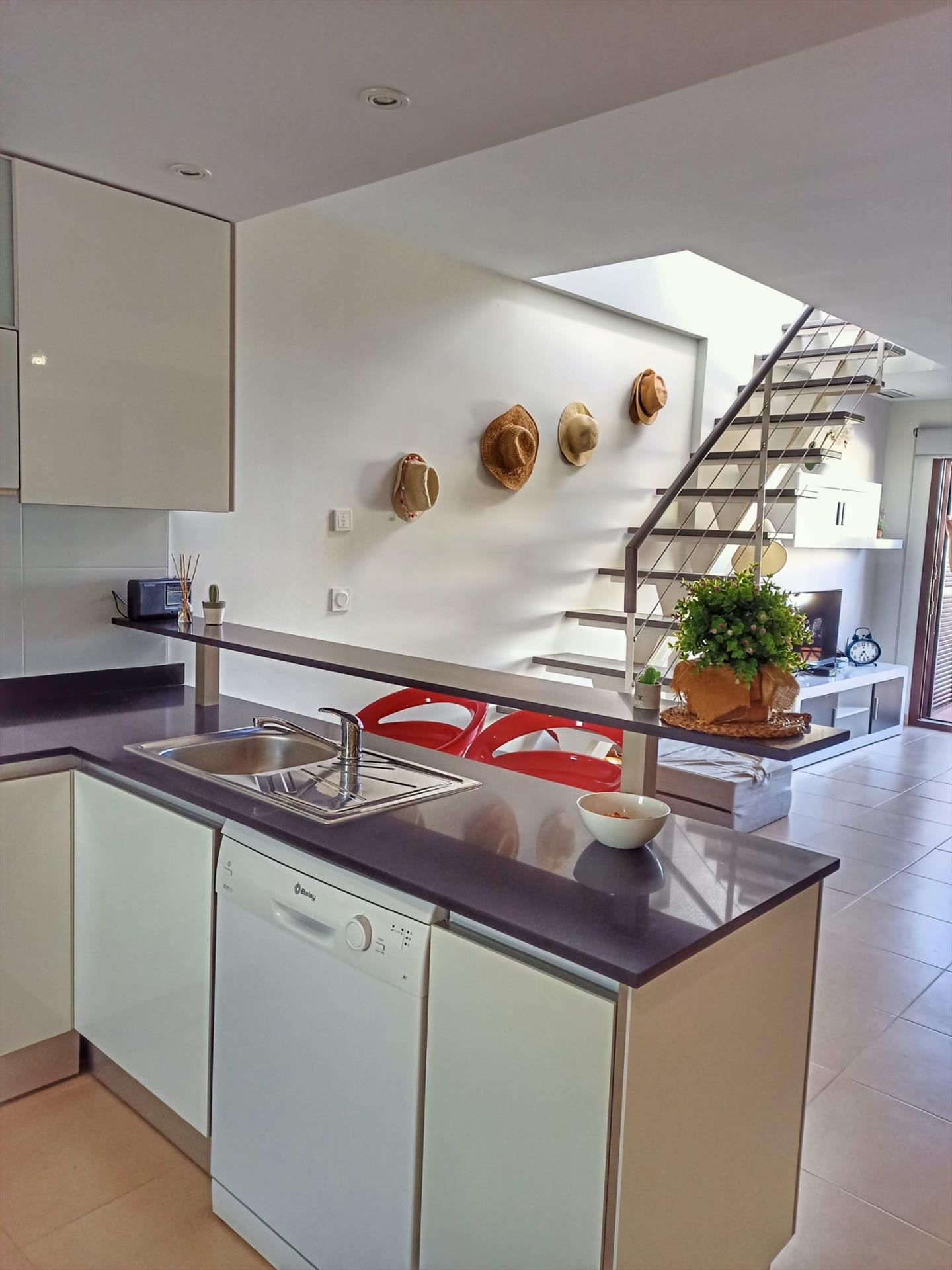 • offene Küche mit Elektroherd, Elektrobackofen, Mikrowelle, Geschirrspüler, Kühlschrank mit Gefrierfach, Kaffeemaschine, Mixer und Toaster