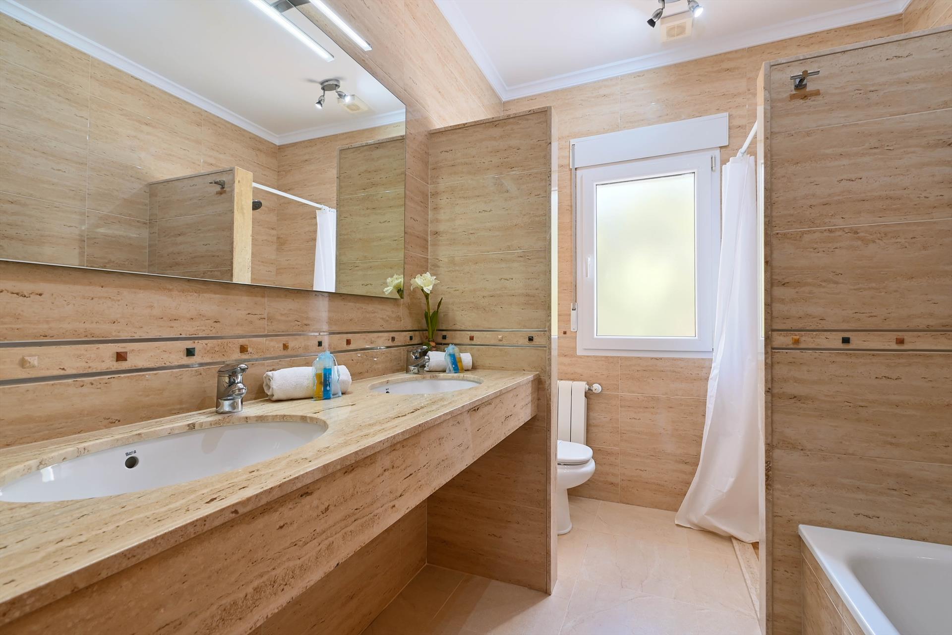 • Badezimmer mit Doppelwaschbecken, Badewanne, Dusche und Toilette