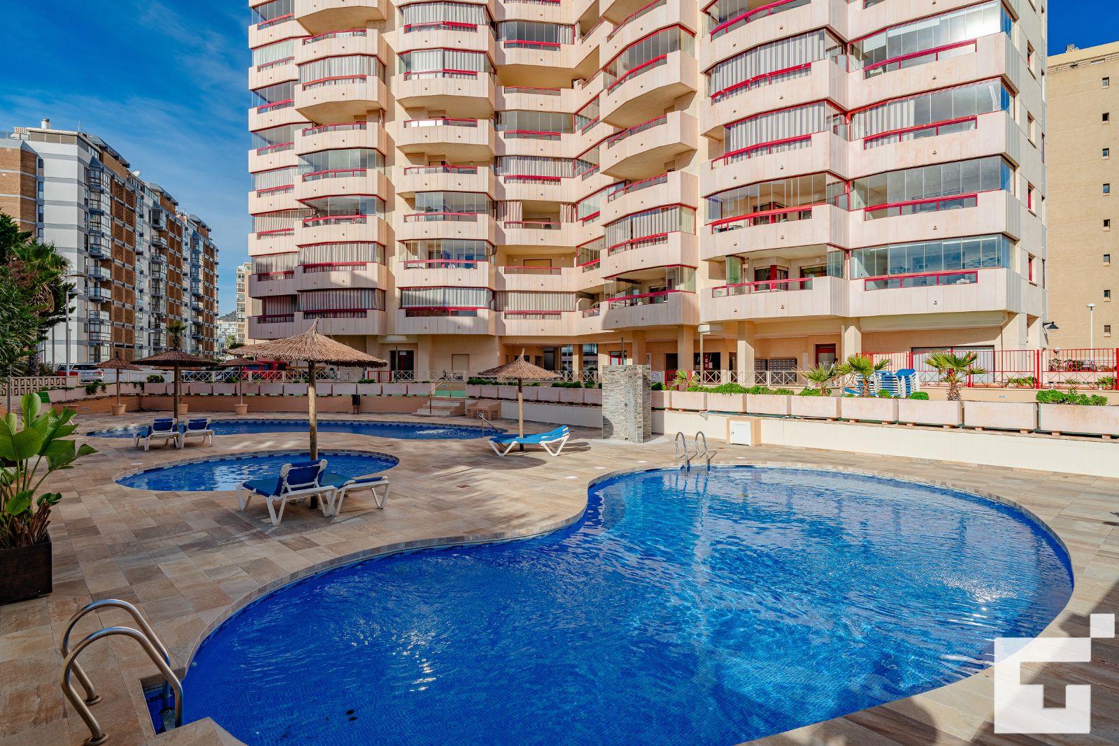 Apartment mit Gemeinschaftspool in Calpe, Costa Blanca, Spanien für 6 Personen. Das Apartment befindet sich in der Nähe von Restaurants und Bars, Geschäften und Supermärkten, nur 25 m vom Strand Playa Arenal-Bol entfernt.
