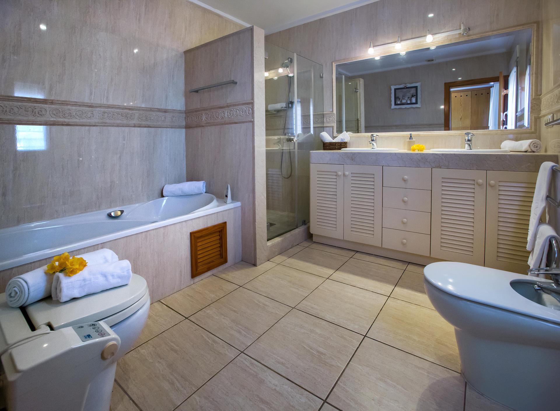 • 2 Badezimmer, jeweils mit Einzelwaschbecken, Badewanne/Dusche-Kombination, Bidet und Toilette