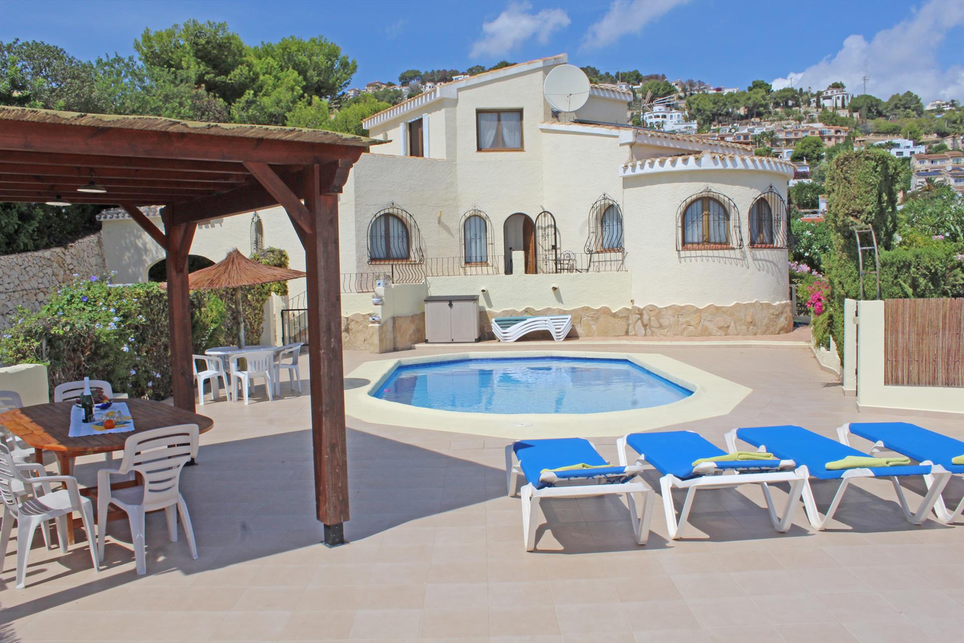 Schöne und komfortable Villa in Moraira, Costa Blanca, Spanien, mit privatem Pool für 6 Personen. Das Haus befindet sich in einer Wohngegend und ist 3 km vom Strand entfernt.