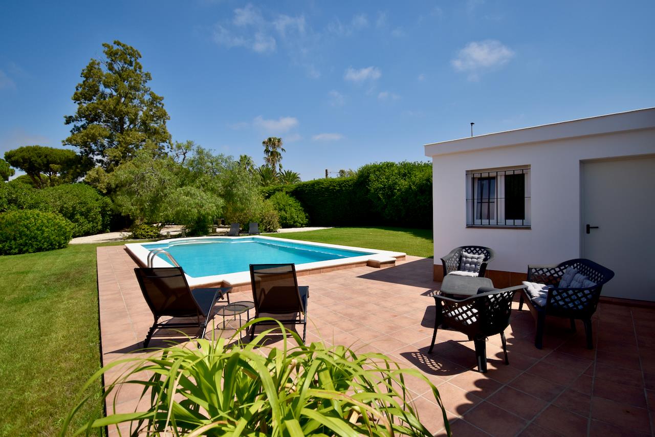 Große und komfortable Villa mit privatem Pool in Chiclana de la Frontera, Costa de la Luz, Spanien für 6 Personen. Das Haus befindet sich in einem ruhigen Wohngebiet am Strand und ist 4 km von El Colorado entfernt.