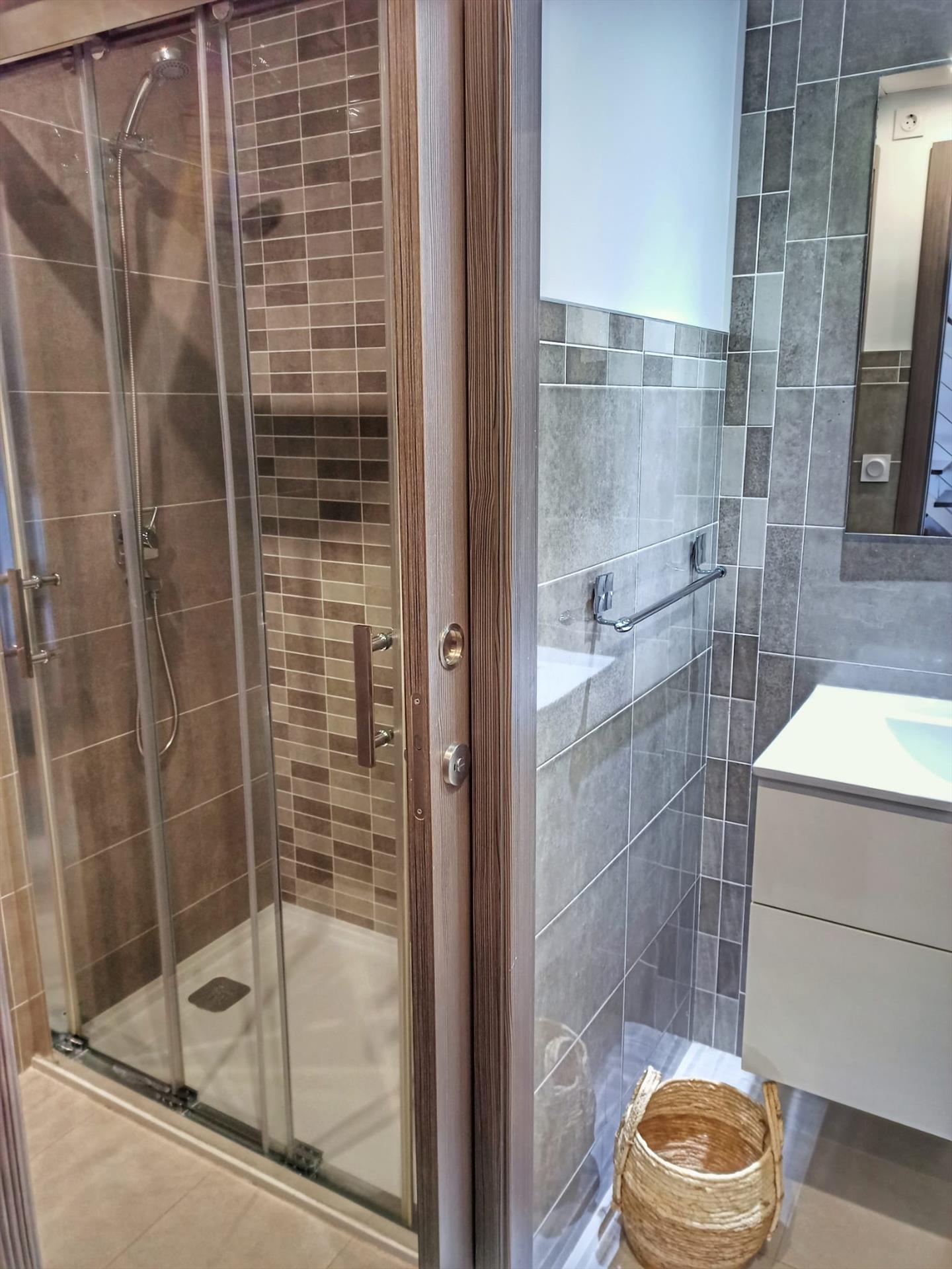 • bathroom with single washbasin, shower, toilet and hairdryer