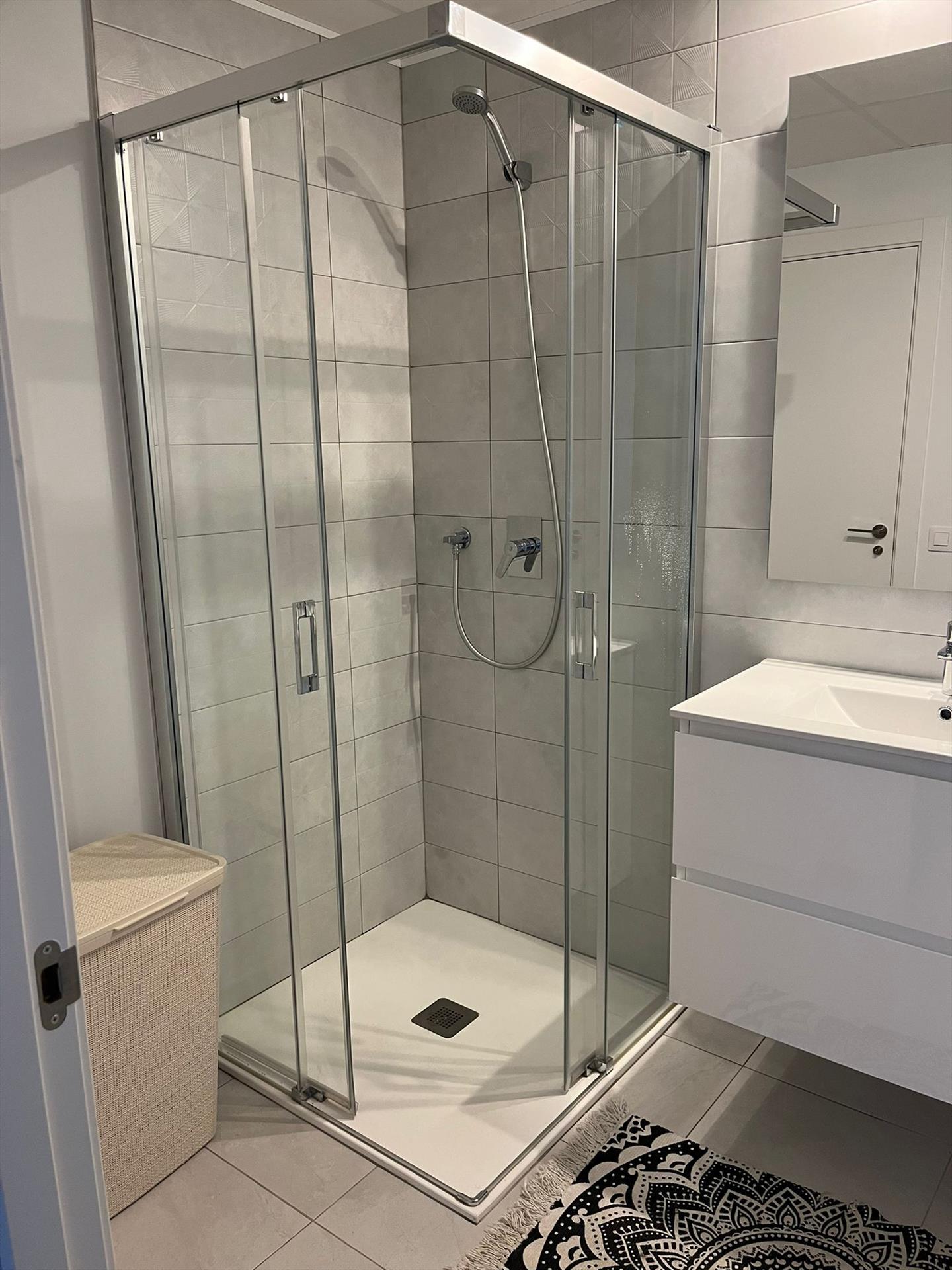 - en-suite bathroom with shower, toilet and hairdryer