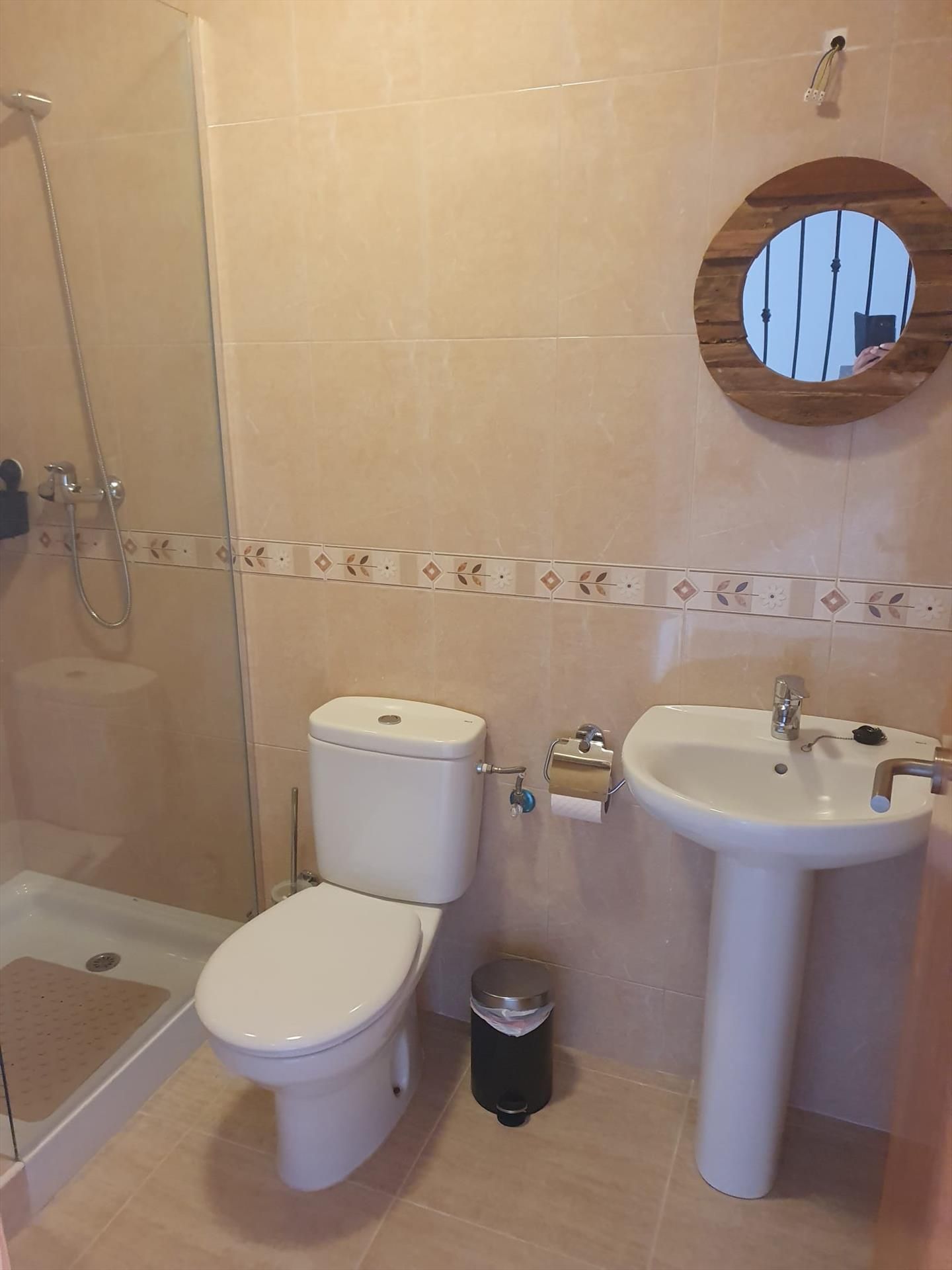 • bathroom with single washbasin, shower, toilet and hairdryer