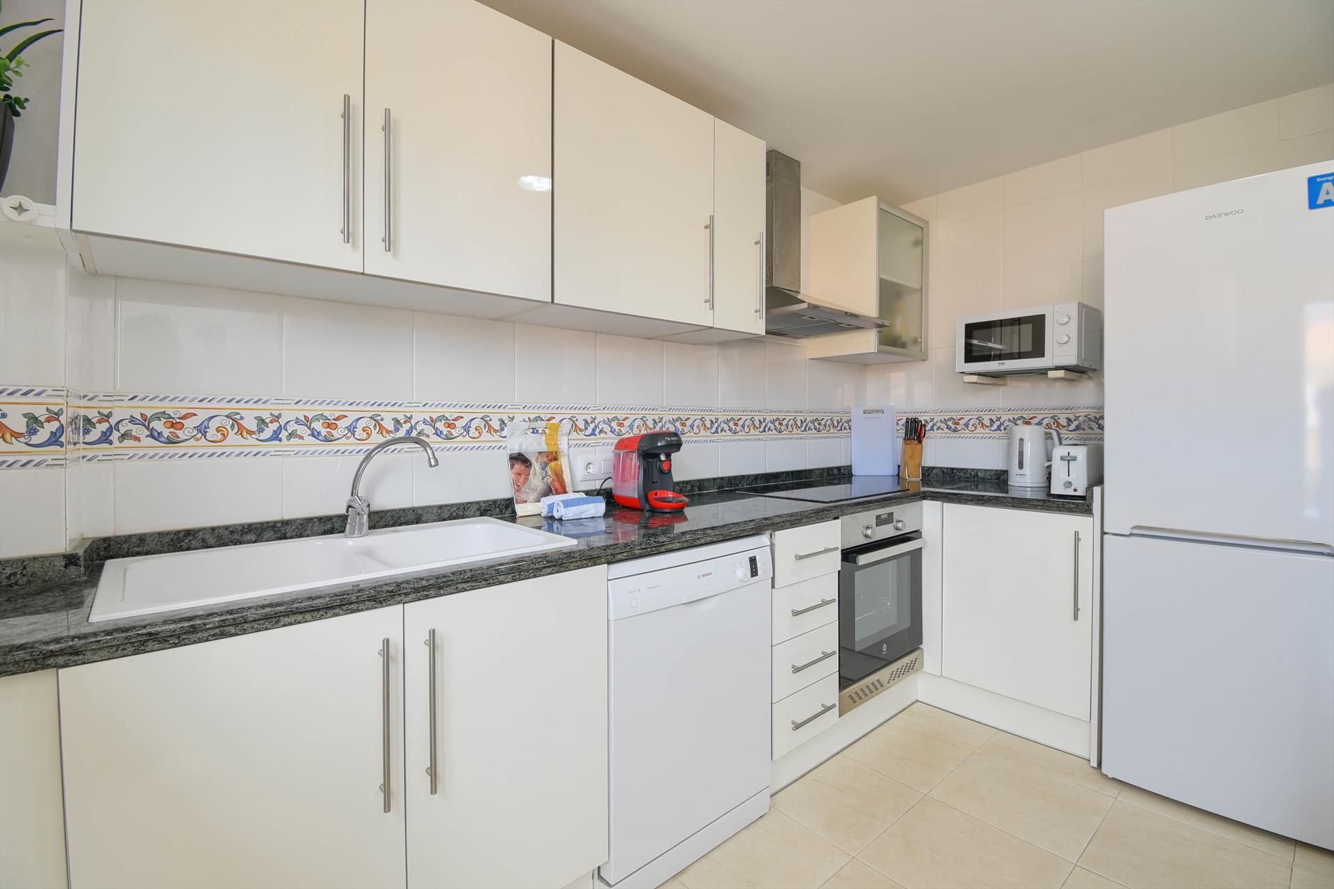 • kitchen with electric hob, electric oven, microwave, dishwasher, refrigerator-freezer, coffee machine, electric kettle, mixer, toaster and juicer