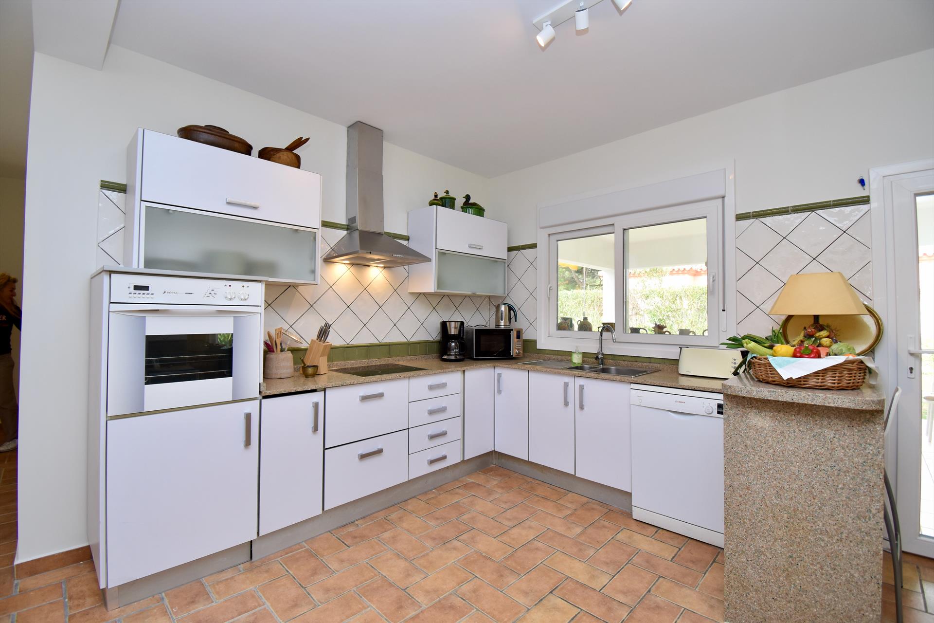 • open kitchen with electric hob, electric oven, microwave, dishwasher, refrigerator-freezer, coffee machine, electric kettle and toaster