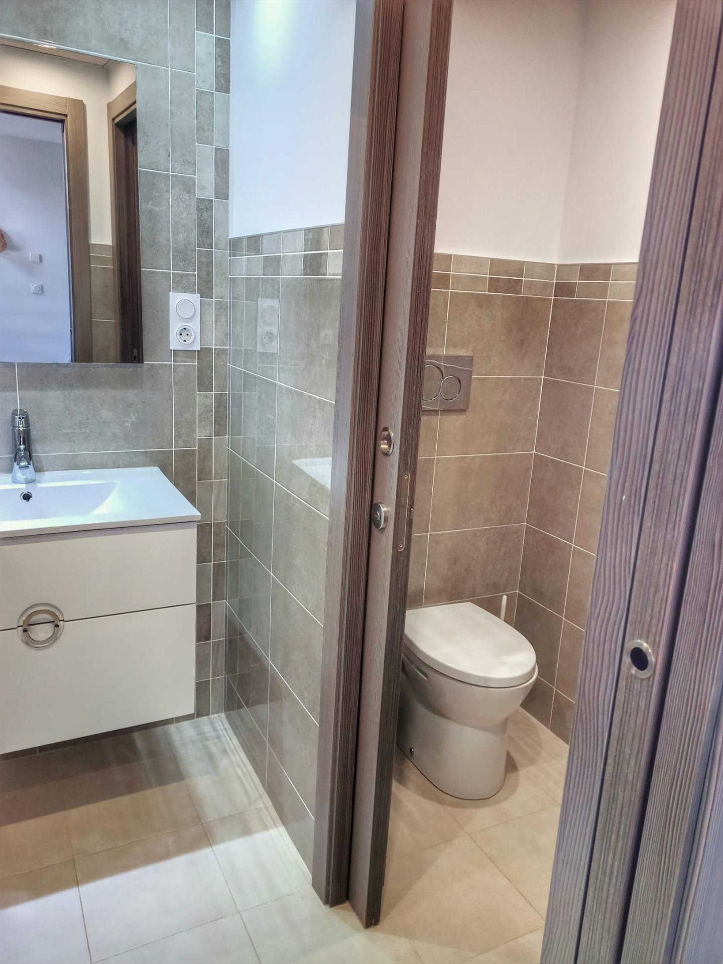 • salon avec lavabo, douche, toilettes et sèche-cheveux