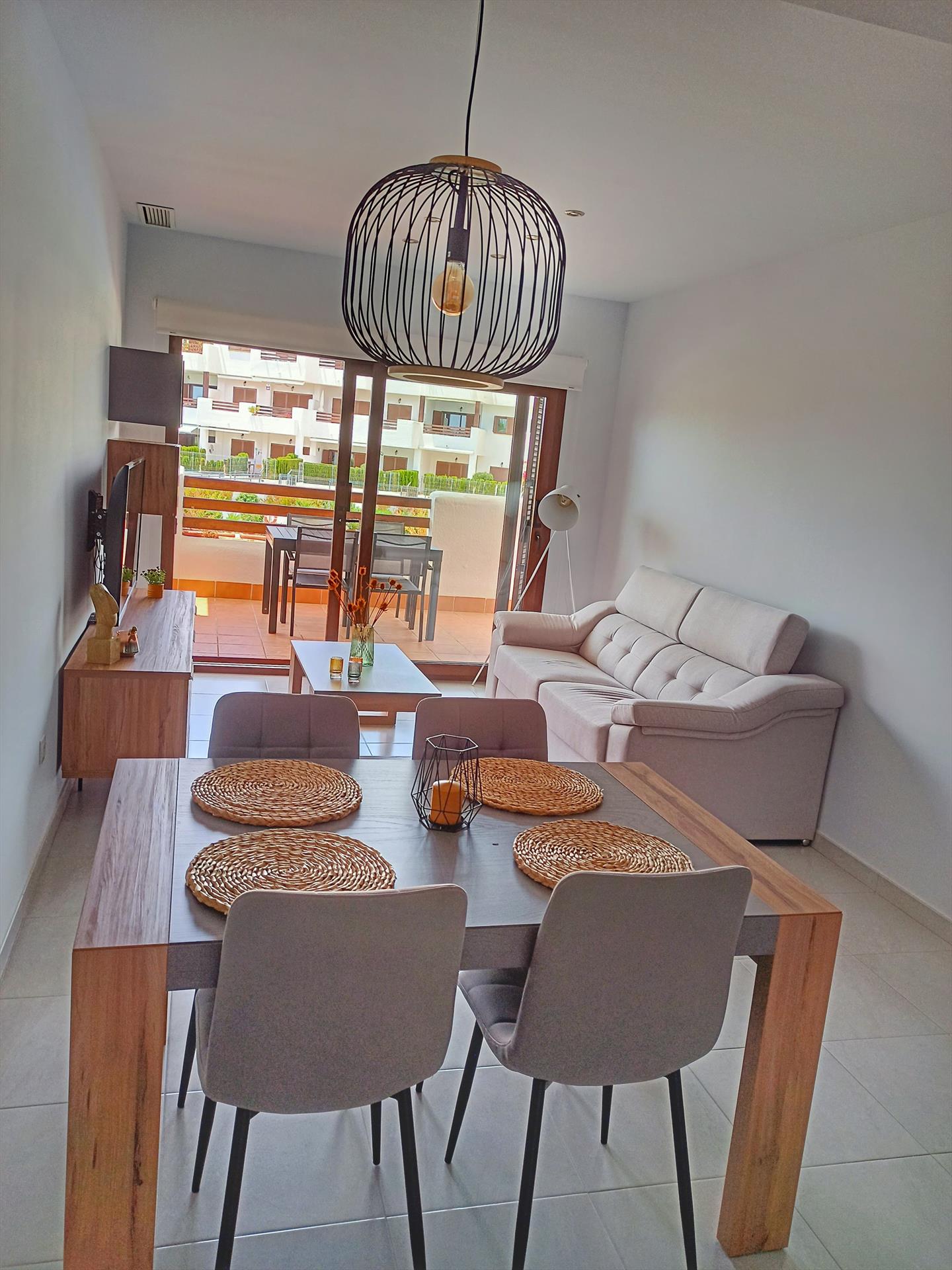L'appartement dispose de 2 chambres et 1 salle de bain. Le logement offre un jardin commun avec pelouse, agrémenté d'arbres et de vues magnifiques sur le jardin. Son confort et la proximité de la plage, des commerces, des activités sportives, des installations de divertissement, des sites touristiques et de la culture en font un excellent choix pour passer vos vacances en Espagne en famille ou entre amis.