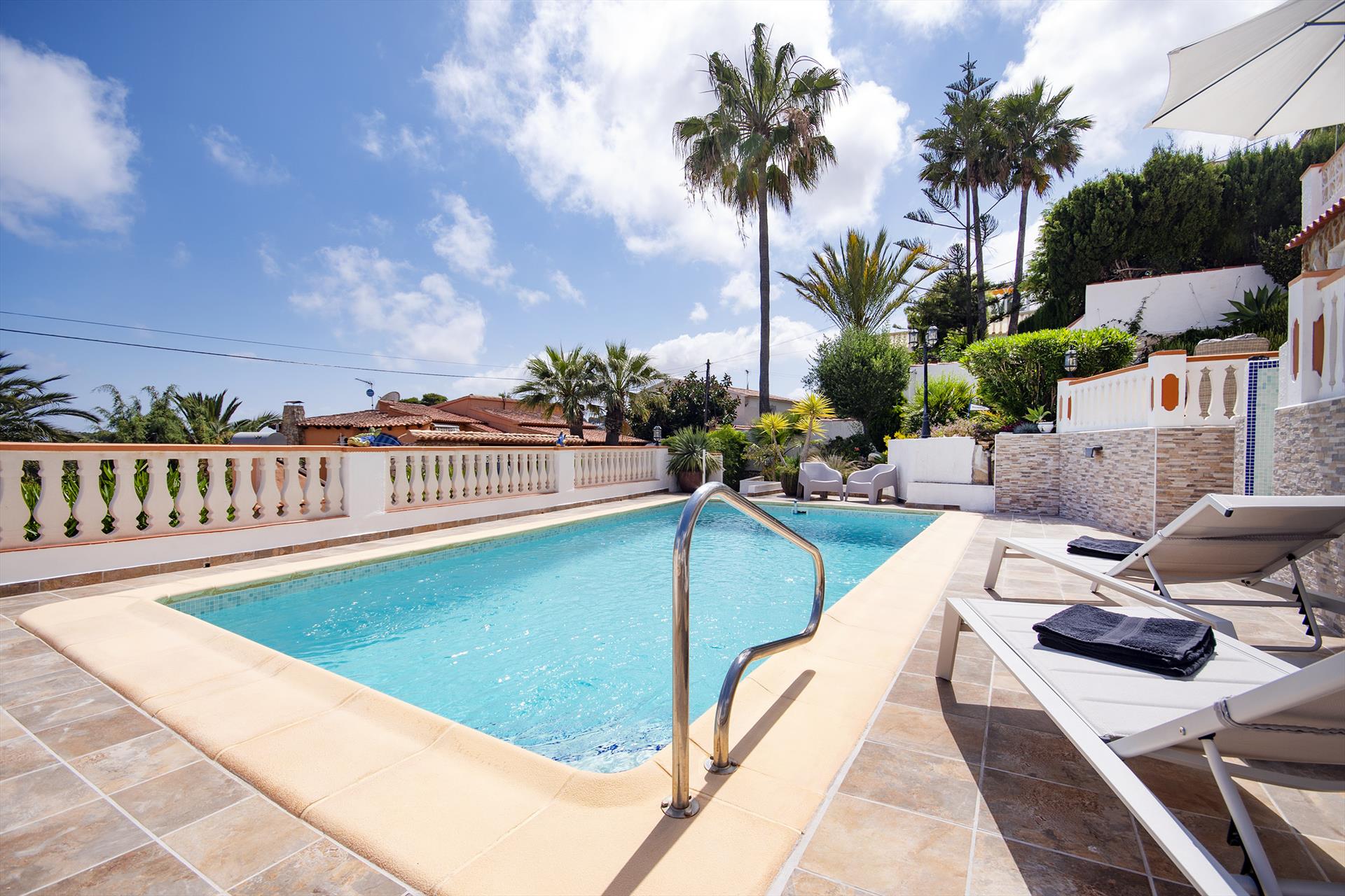 Magnifique et ensoleillée villa à Benissa, Costa Blanca, Espagne, avec piscine privée pour 4 personnes. La maison est située dans un quartier résidentiel côtier et vallonné, à 2 km de la plage de Cala Baladrar et à 5 km de Moraira.