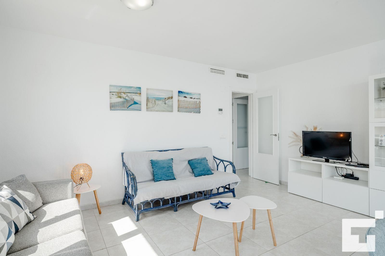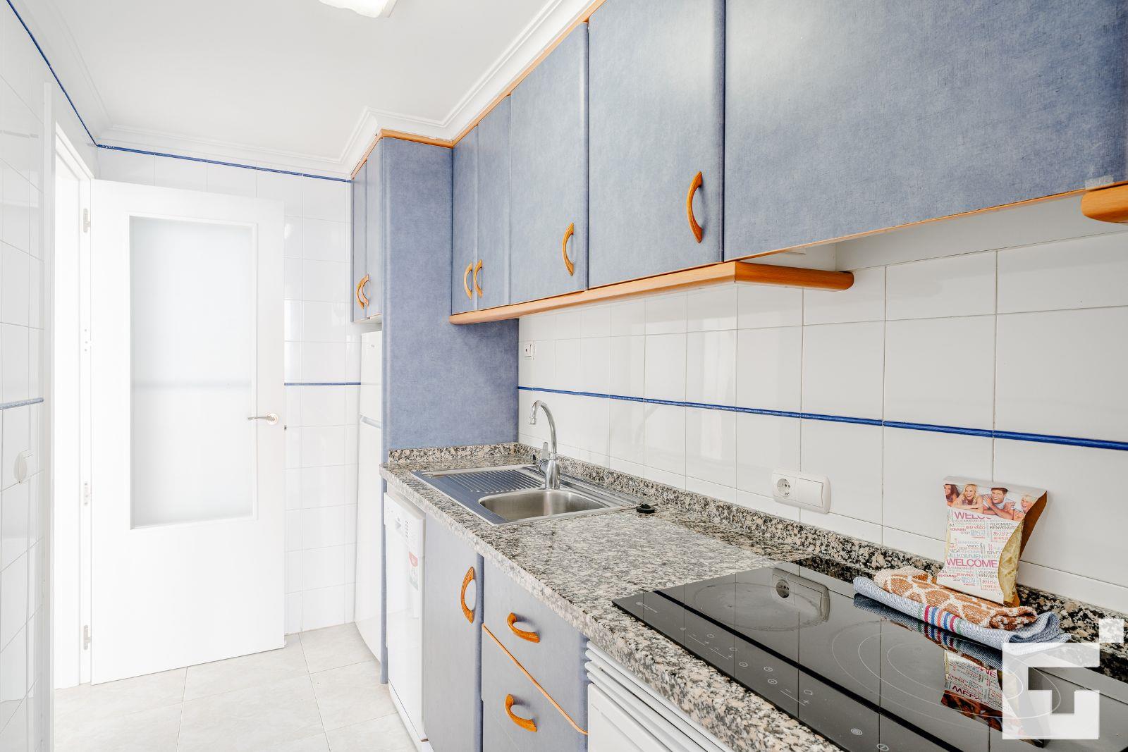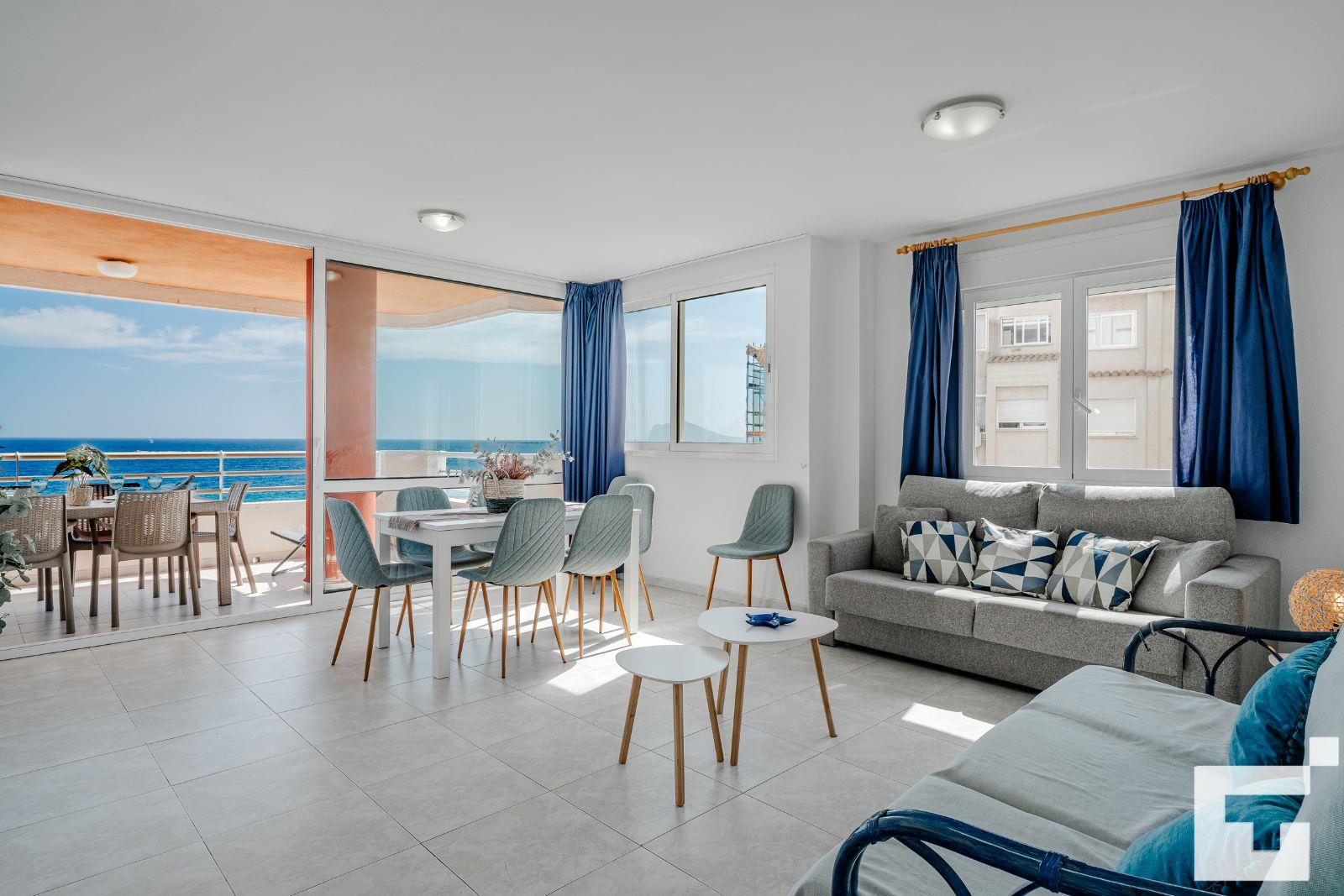 Appartement à Calpe, Costa Blanca, Espagne, avec piscine commune pour 7 personnes. L'appartement est situé à proximité de restaurants et bars, de magasins, de supermarchés et d'un court de tennis, et se trouve à 25 m de la plage de Playa Cantal Roig.