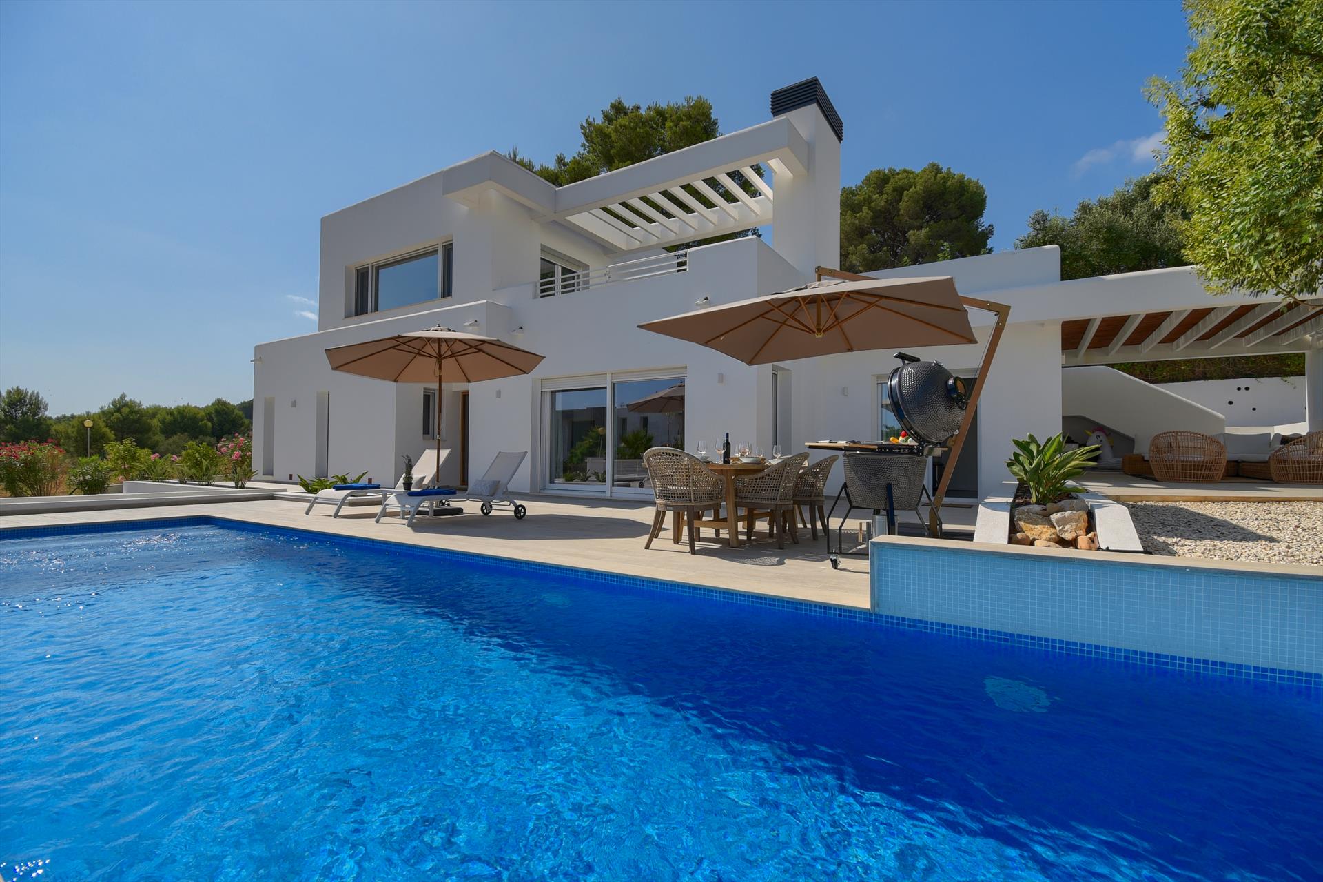 Villa moderne et confortable avec piscine privée à Xàbia, Costa Blanca, Espagne pour 6 personnes. La maison est située dans une zone résidentielle proche de la plage.