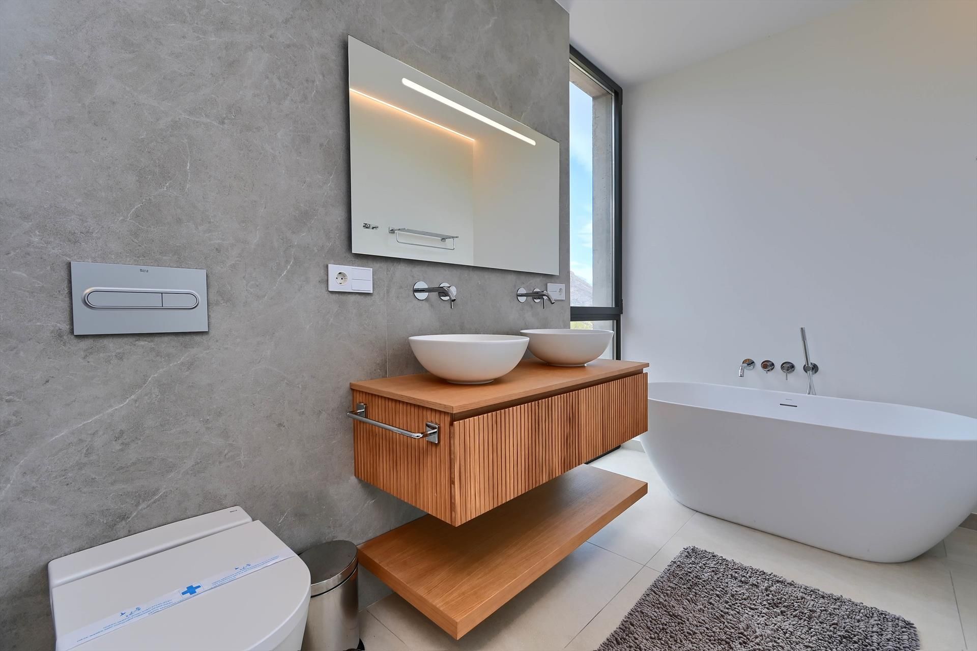 • salle de bain attenante avec double lavabo, baignoire, douche et toilette