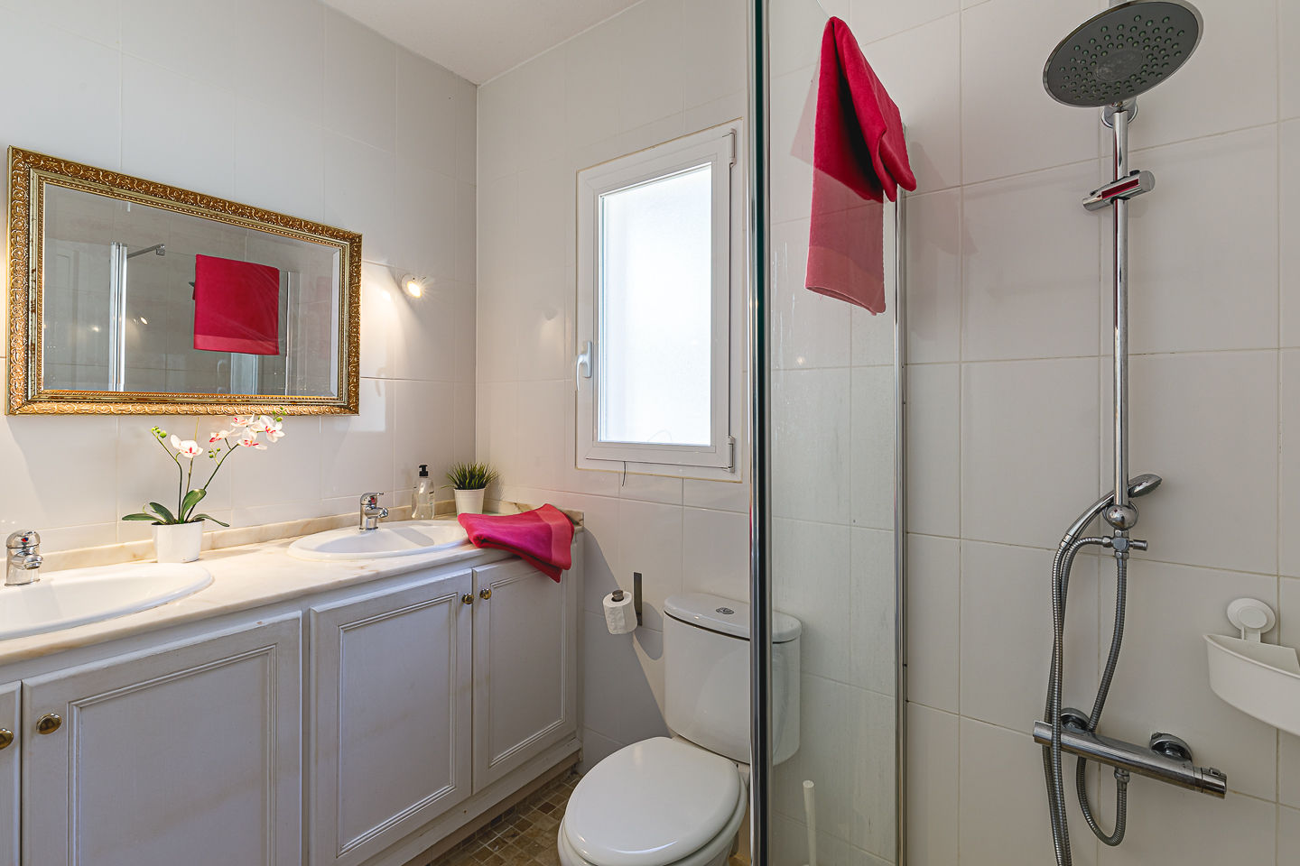 • badkamer met dubbele wastafel, douche en toilet