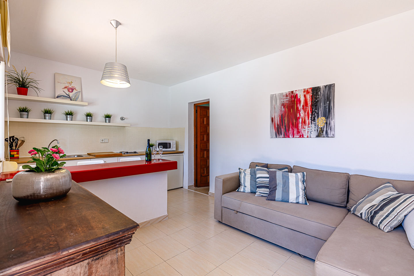 • open keuken met elektrische kookplaat, magnetron en koffiezetapparaat