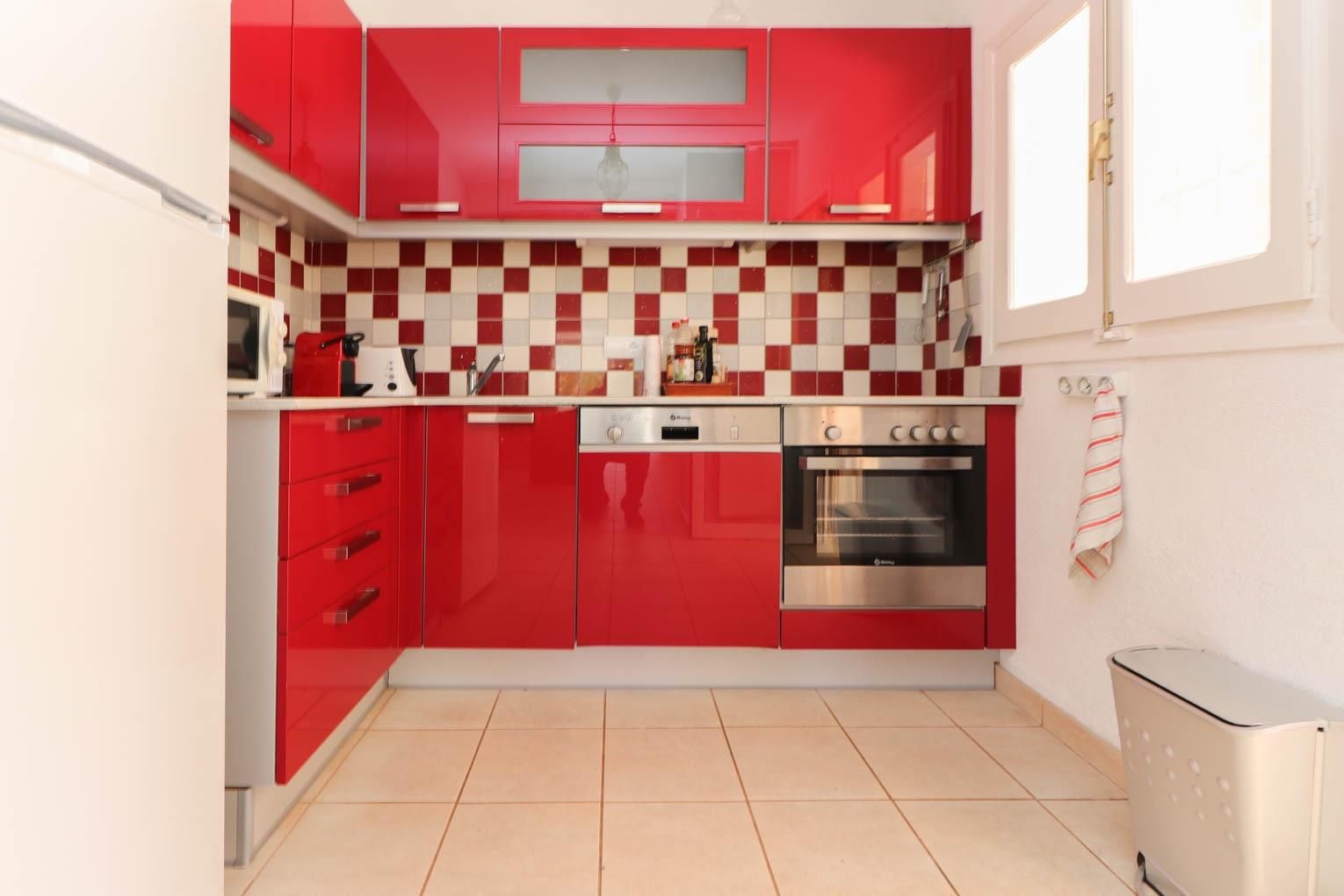 • open keuken met elektrische kookplaat, elektrische oven, magnetron, vaatwasser, koelkast-vriescombinatie, koffiezetapparaat, waterkoker, broodrooster en juicer