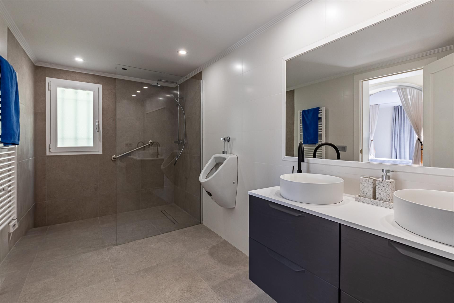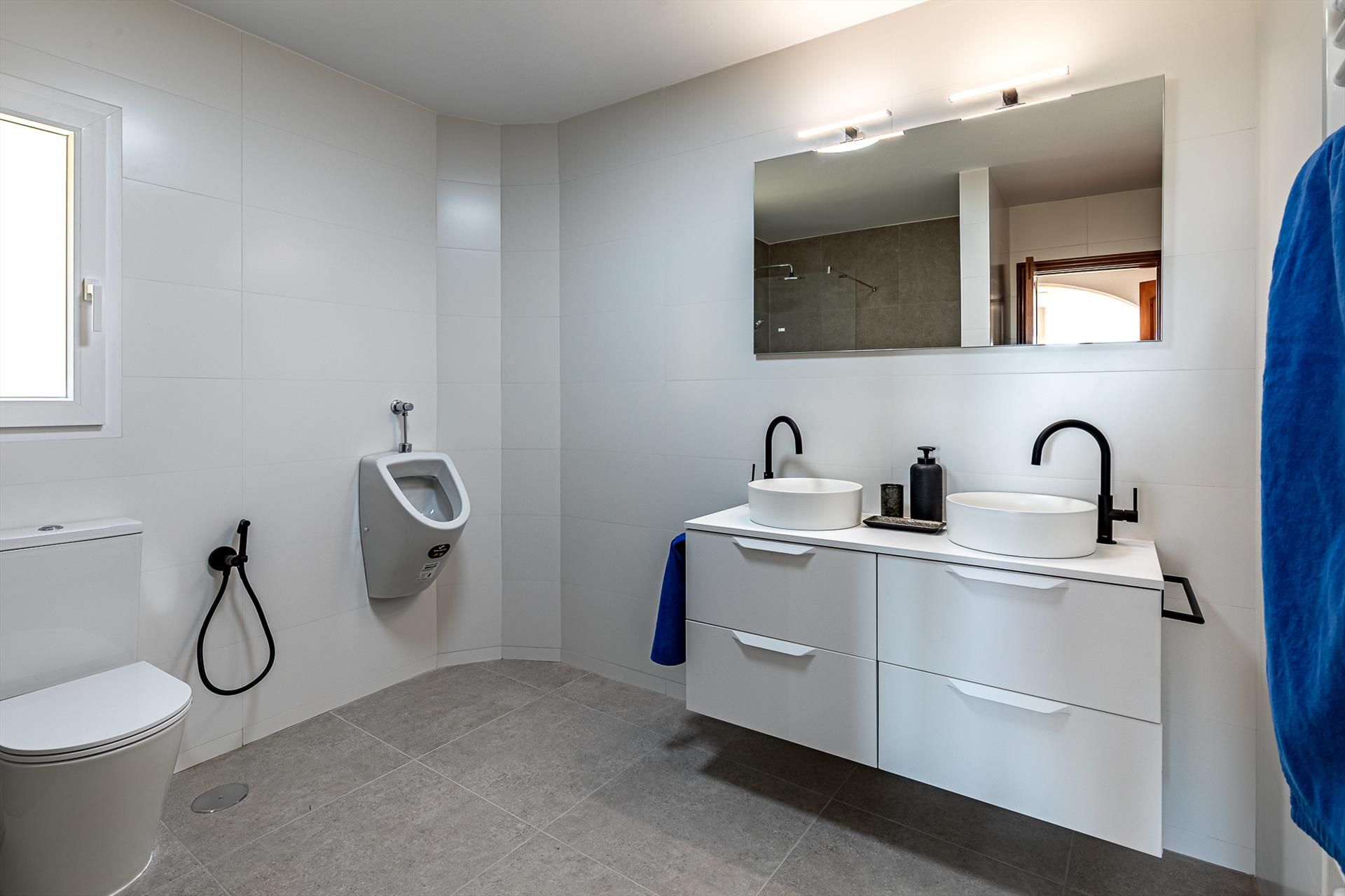 • en-suite badkamer met dubbele wastafel, douche, toilet en haardroger