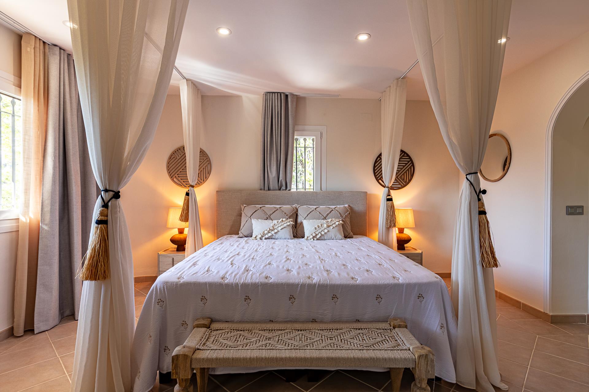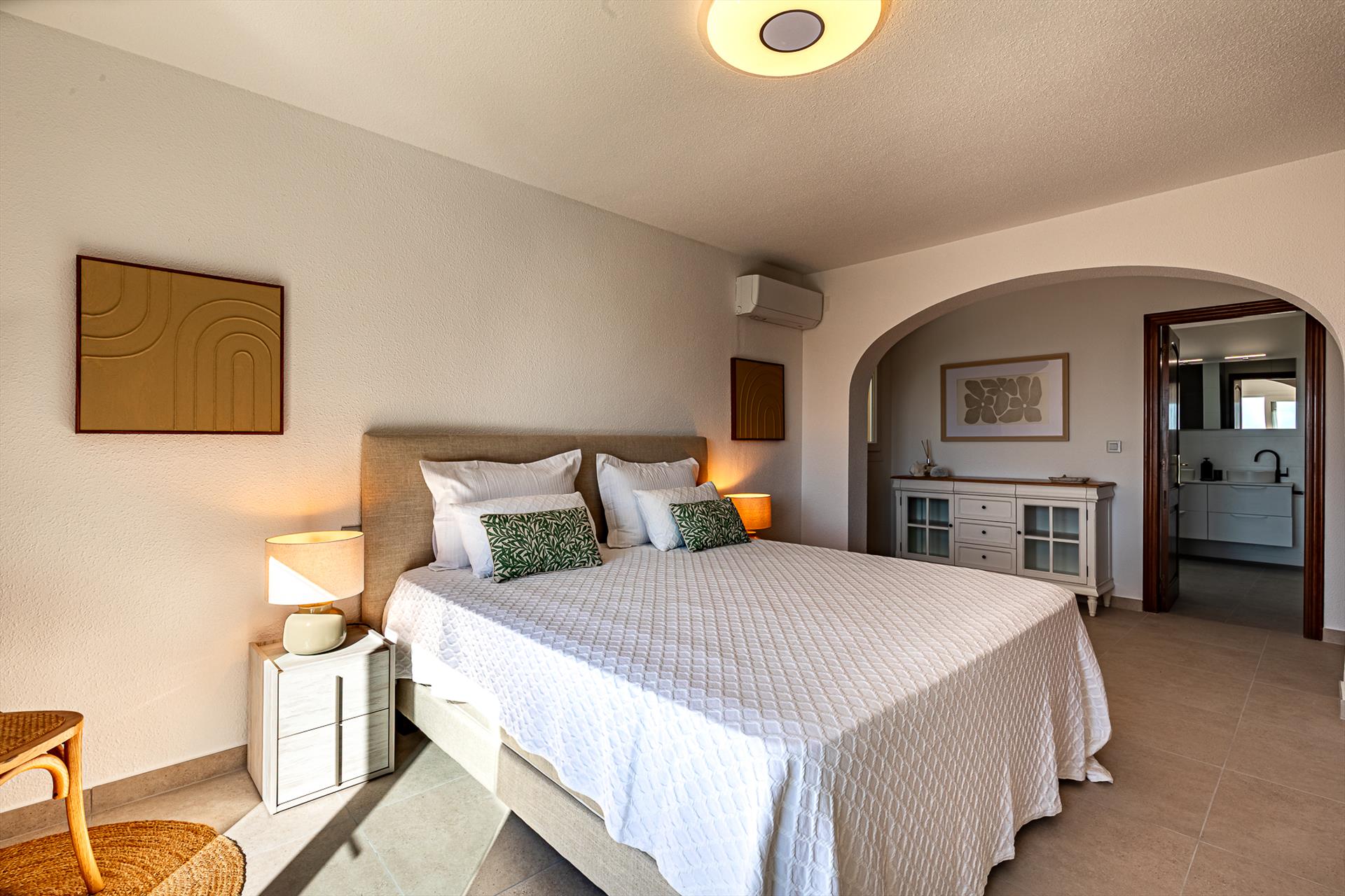 • 2 slaapkamers met airconditioning, elk met een kingsize bed (met een afmeting van 200 bij 180 cm) en en-suite badkamer