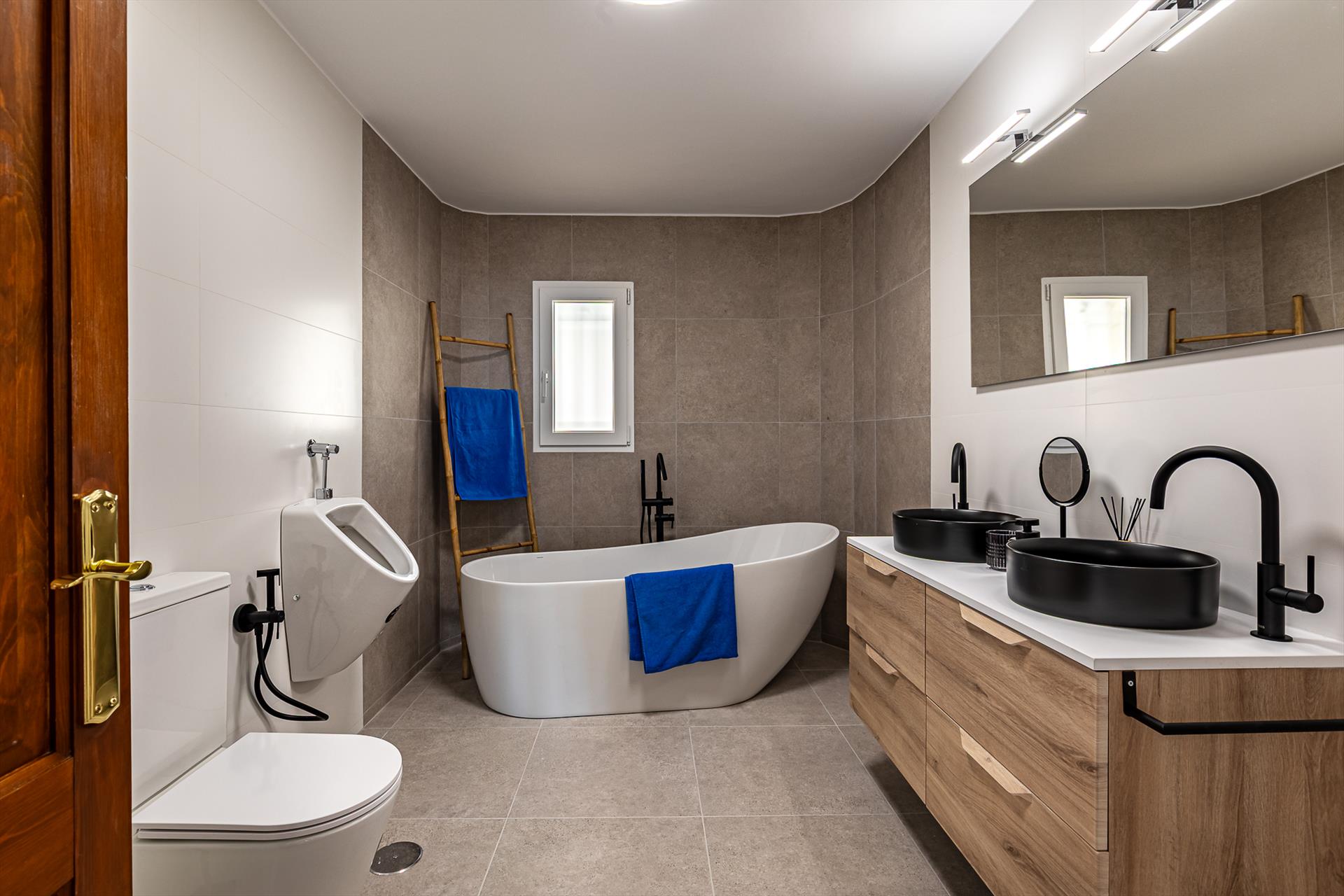 • en-suite badkamer met dubbele wastafel, bad, toilet en haardroger