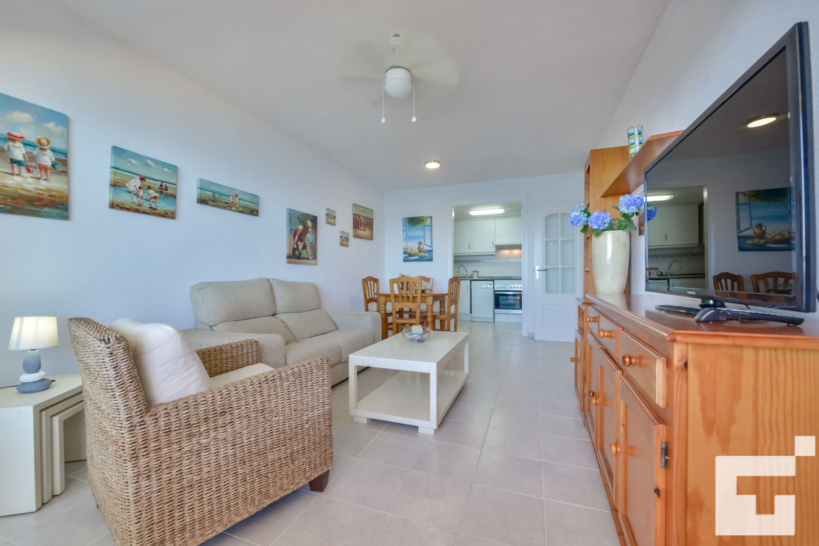 • woon/eetkamer met airconditioning, televisie en plafondventilator