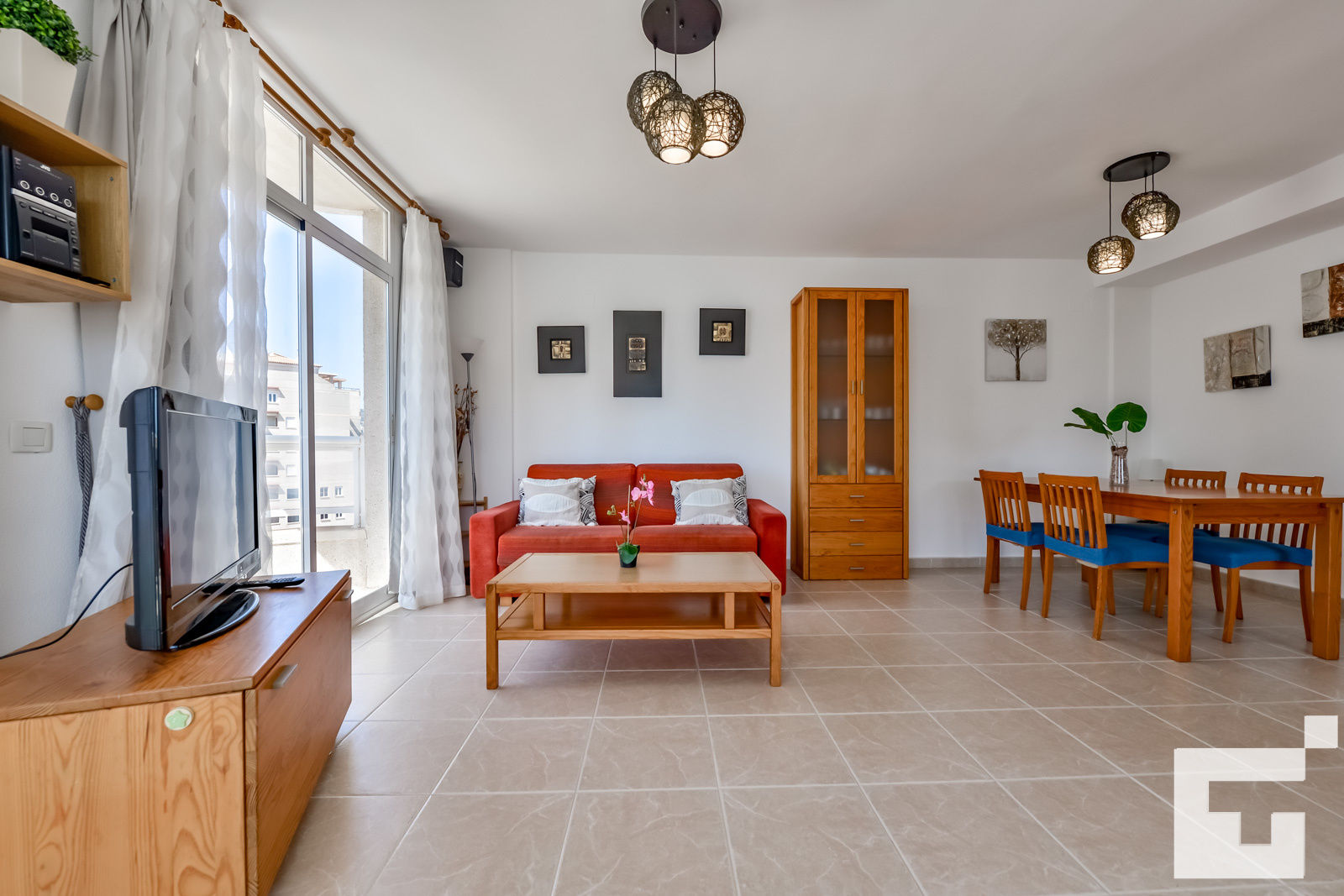 • woonkamer met airconditioning, televisie, hifi en slaapbank