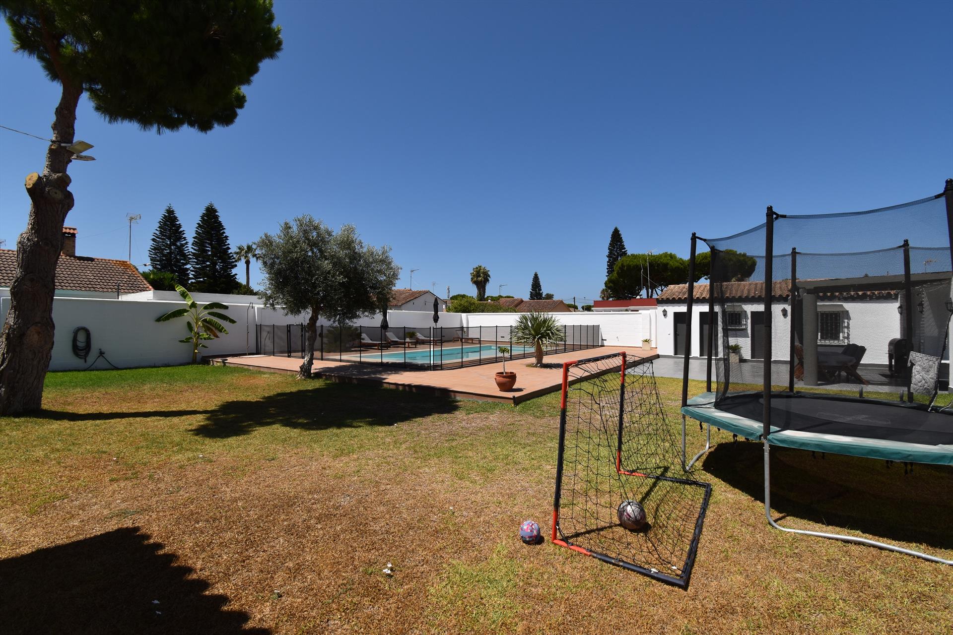 Mooie en comfortabele villa met privézwembad in Chiclana de la Frontera, Costa de la Luz, Spanje voor 10 personen. De woning is gelegen in een residentieel strandgebied, dicht bij winkels en supermarkten, en op 4 km van het strand La Barrosa.