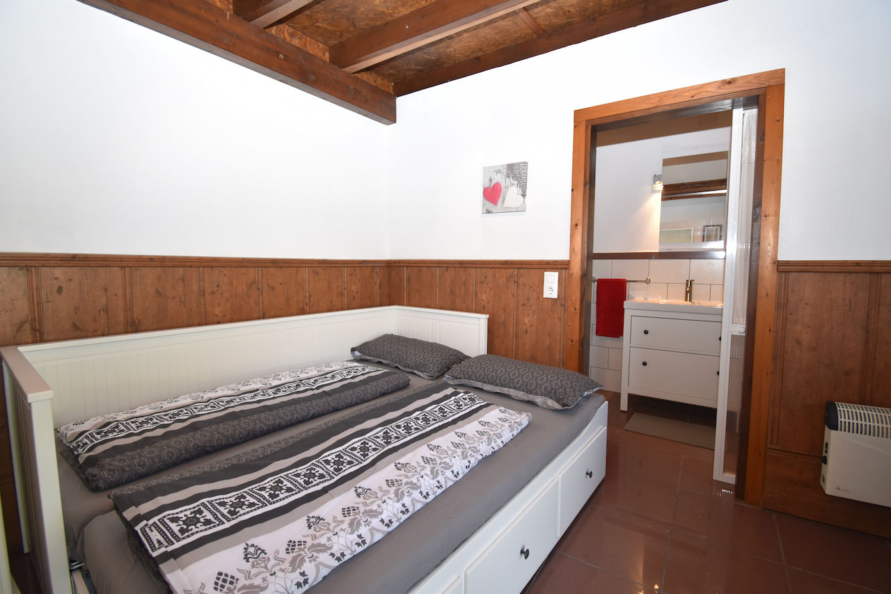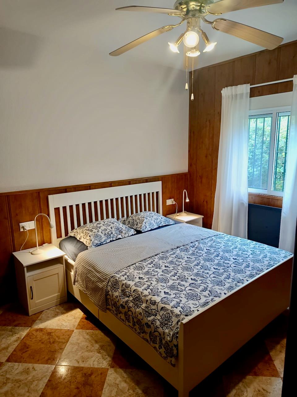 - slaapkamer met queensize bed (afmetingen 200 bij 160 cm), ventilator en en-suite badkamer